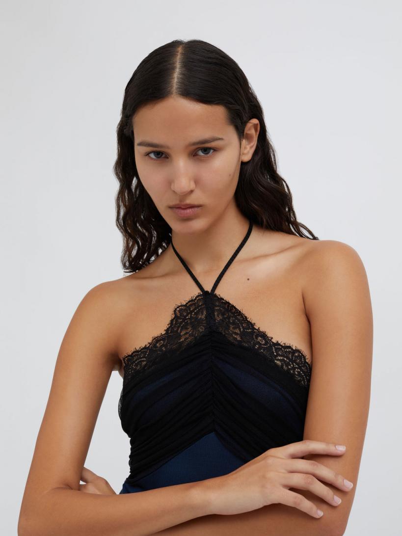 Christopher Esber TOPS | WOMENS Tulle Overlay Ribbed Bodysuit BLUE GRAPHITE BLACK