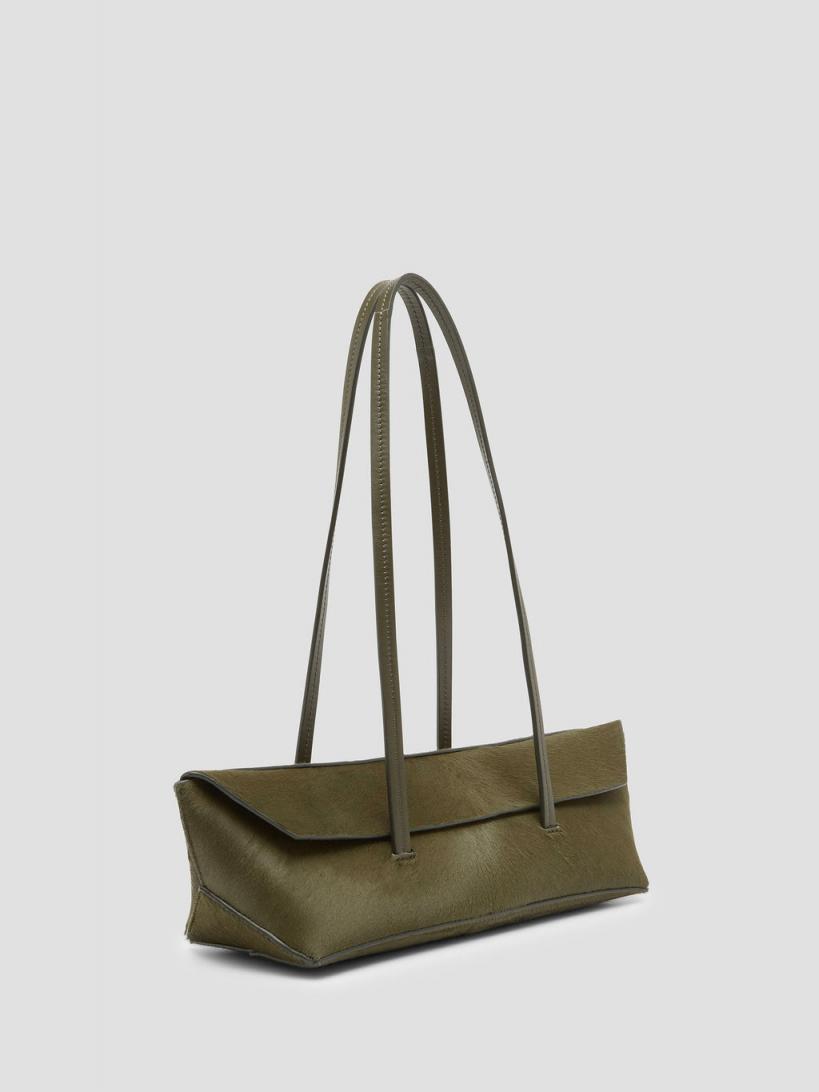 Decisive lines and texture combine to form this mini tote bag. Designed with sculptural folds and peaks, its minimal flap opening can be tucked in to reveal an embossed custom logo. Made in Spain from Italian sourced Leather Minimalist flap opening Contains detachable mini purse Internal custom embossed logo patch Short hair texture – natural characteristics Width: 30cm Height: 12.5cm Depth: 12cm Top Width: 41cm Shoulder Drop: 30cm 100% Calf Leather Contrast: 100% Calf Leather Nappa