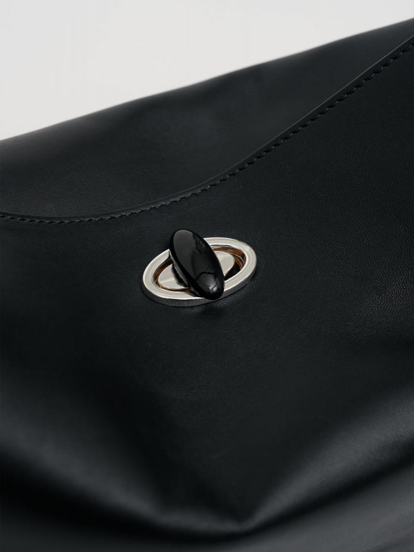 A slouchy shoulder hobo bag crafted in a smooth italian sourced Sheepskin Nappa. Its fine strap can be slung over the shoulder or carried by hand. Anchored by a Black Agate turnlock hardware that enhances strength and protection. Softly structured Sheepskin Nappa Magnetic turnlock hardware Fine fixed shoulder strap Silver embossed logo patch interior Featured stone: Black Agate – enhances strength and protection 100% sheepskin nappa, lining: 100% cow leather, hardware: 100% brass with natural stone Dimensions: Width – 26cm Height- 20cm Depth – 14cm Shoulder drop – 15cm