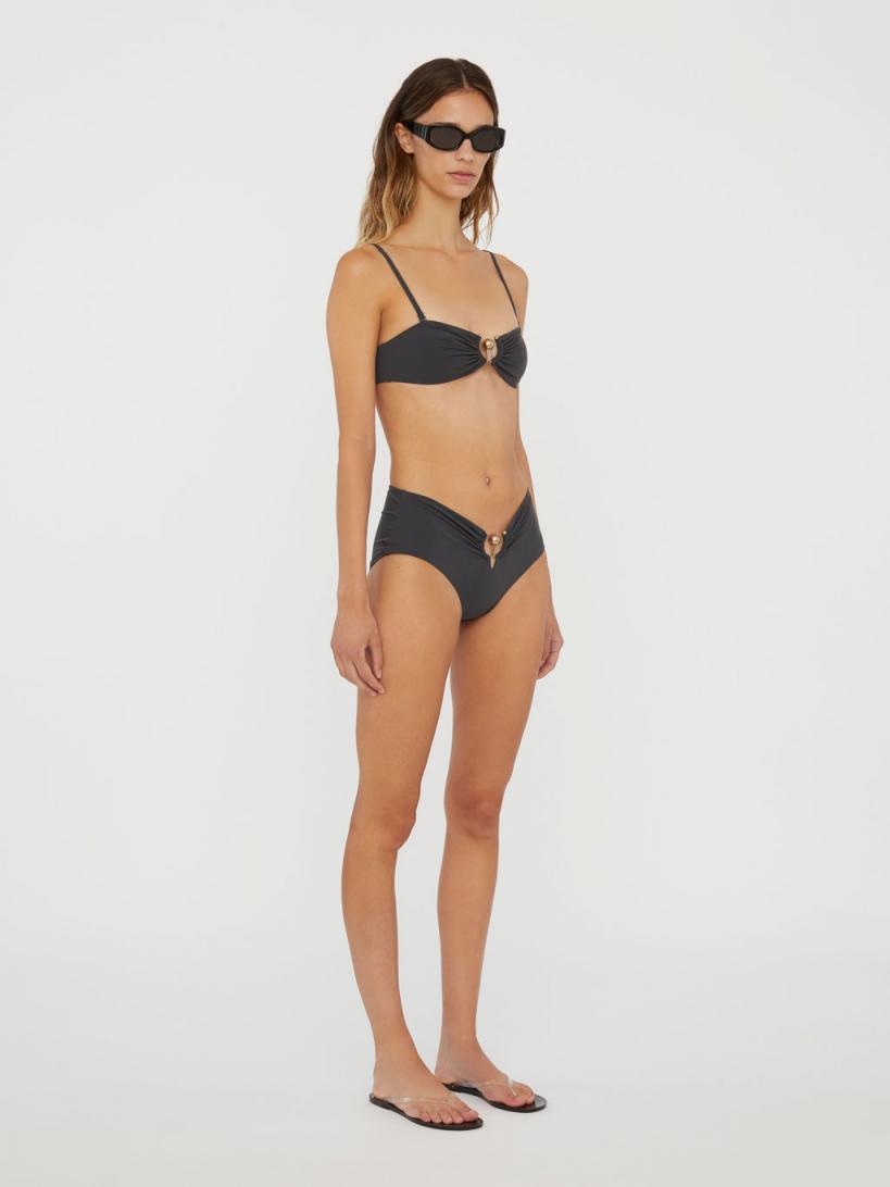Hooked with a sculpted metal adornment, this strapless bandeu bikini top is ruched and anchored by signature hardware. Signature brass orb hardware Adjustable removable straps True to size with a close fit Fully lined Matte finish True to size Main: 72% Polyamide 28% Elastane, Hardware: 100% Brass Amélie is 180cm/5’11” and wears size AU 8 (US 4)AU sizing