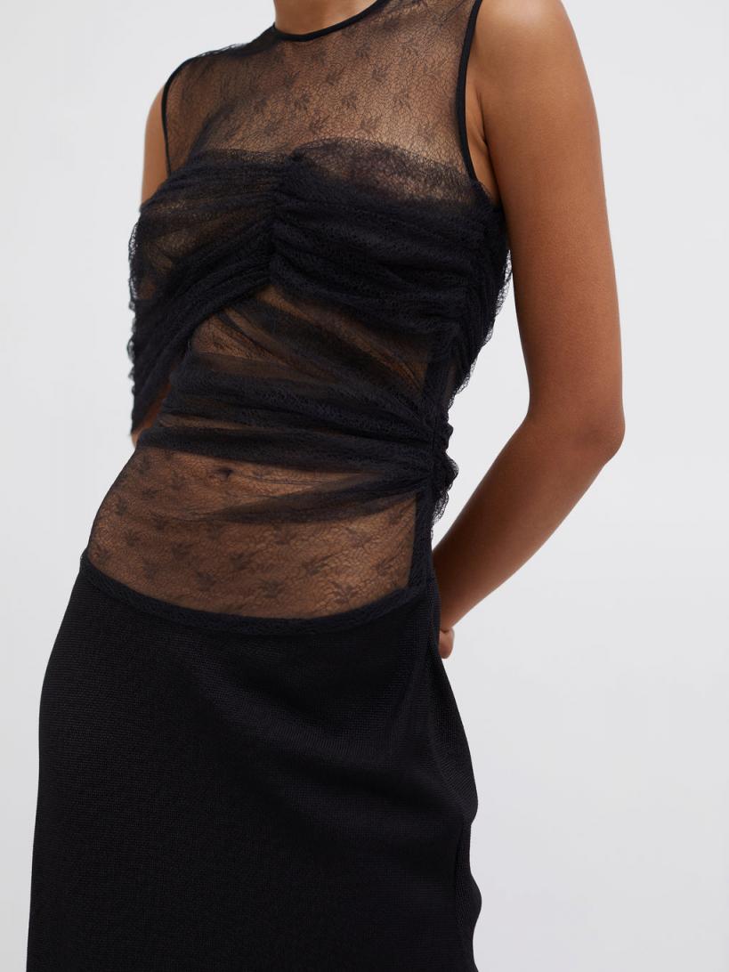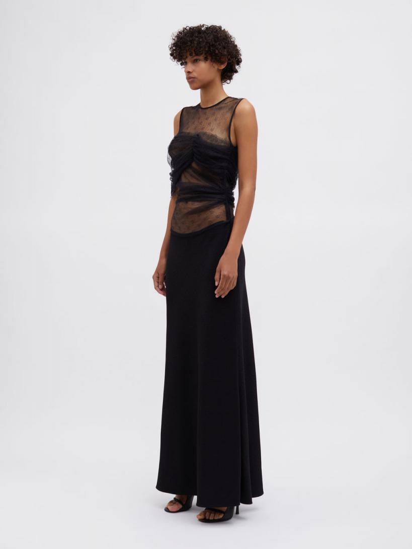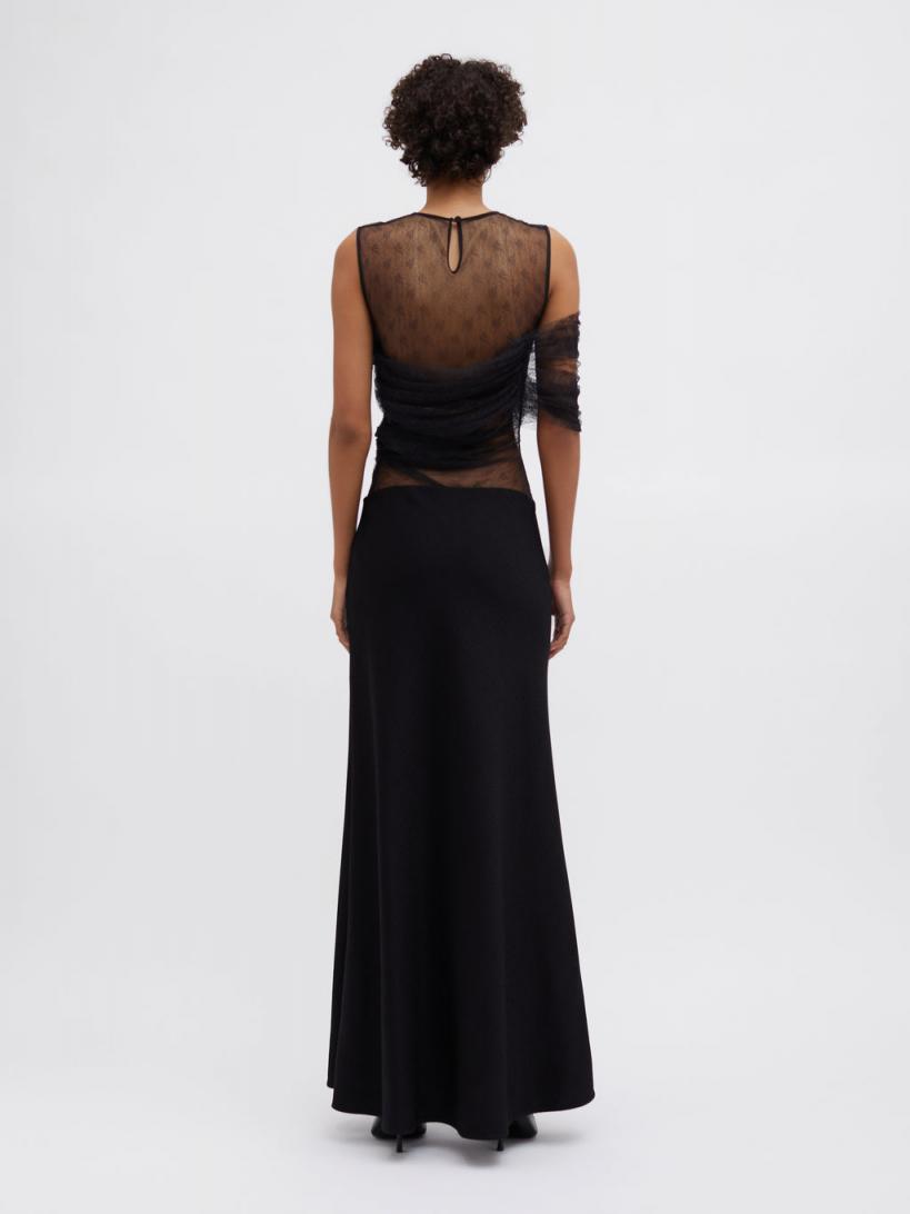 59% Viscose 41% Cotton, 100% Polyamide Basket weave suiting fabric Fine lace detailing Sheer torso Full length silhouette Dry clean only Felicia wears a size 6 AusHeight 177cm/5”9.5”Bust 77cm/30”Waist 60cm/23”Hips 83cm/32”