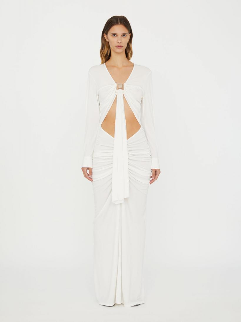 Adorned with bespoke natural stone hardware, this sleeveless round neck maxi dress is ruched to draw the eye in with its considered waist cut out. Sculptural concave hardware insert Sleeveless bodice High round neckline A-line maxi silhouette Lightweight easy to wear rib fabrication Main: 96% Polyester 4% Spandex, Hardware: 100% Natural Stone with Brass frame Featured Stones: Citrine Quartz – Represents joy and prosperity, and enabling positive thinking Clear Quartz – Dispels negativity and enhances mental clarity Smoky Quartz – A grounding stone that instils balance and heightens energy Amélie is 180cm/5’11” and wears size AU 8 (US 4)AU sizing
