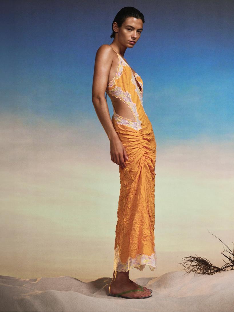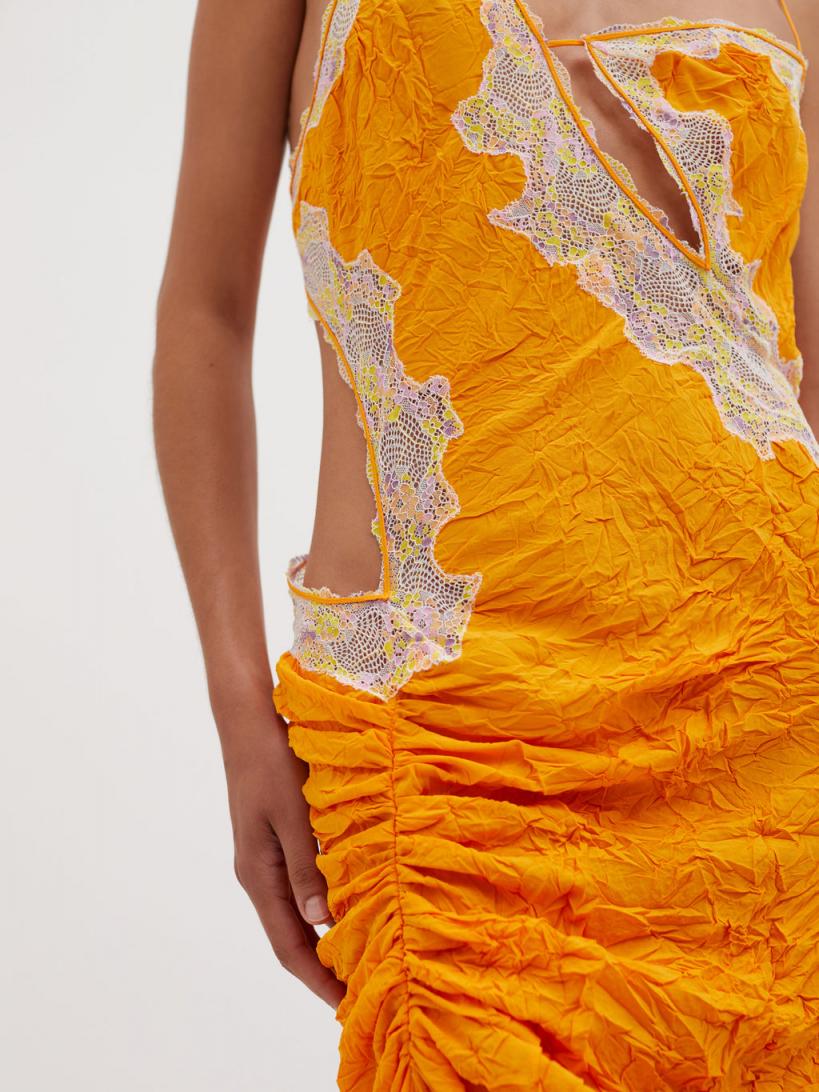 100% Viscose, 65% Polyamide 20% Polyester 15% Elastane Crinkled crepe with Lace trim Signature Christopher Esber cut out details Gathered detailing Midi length Adjustable tie fastening True to size Dry clean only Anna wears a size 6 AusHeight 178cm/5”10”