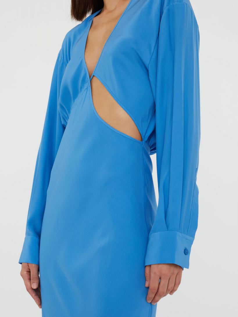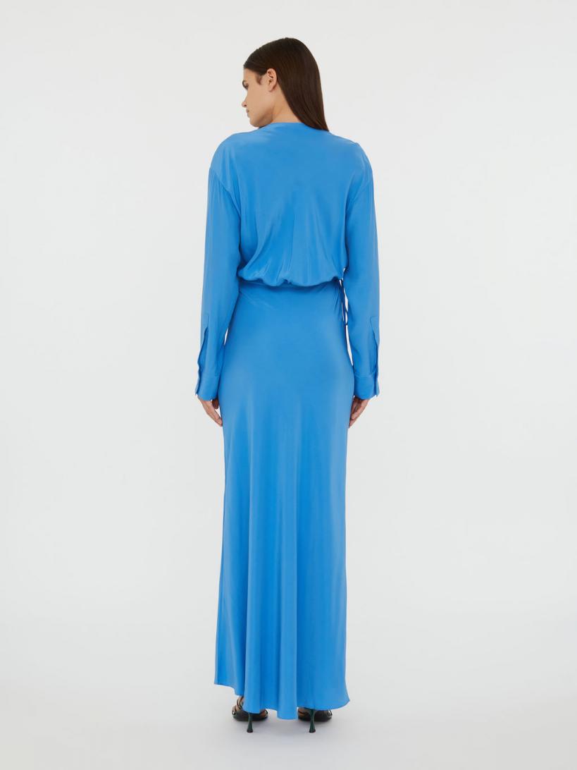 Blending structure and sensuality, this silky long sleeve silhouette reveals an intentional cut out that slices across the bodice. Gently ruched with adjustable ties that shape the waist. Maxi silhouette A-line Skirt Central cut out Fine strap adjustable ties Button closure cuffs Long Sleeves Invisible zip closure 100% Silk Amélie is 180cm/5’11” and wears size AU 8 (US 4)AU sizing