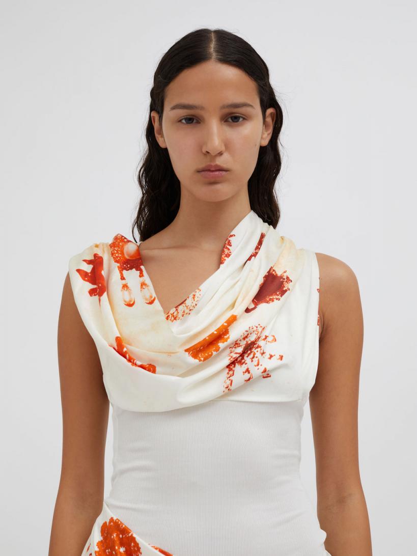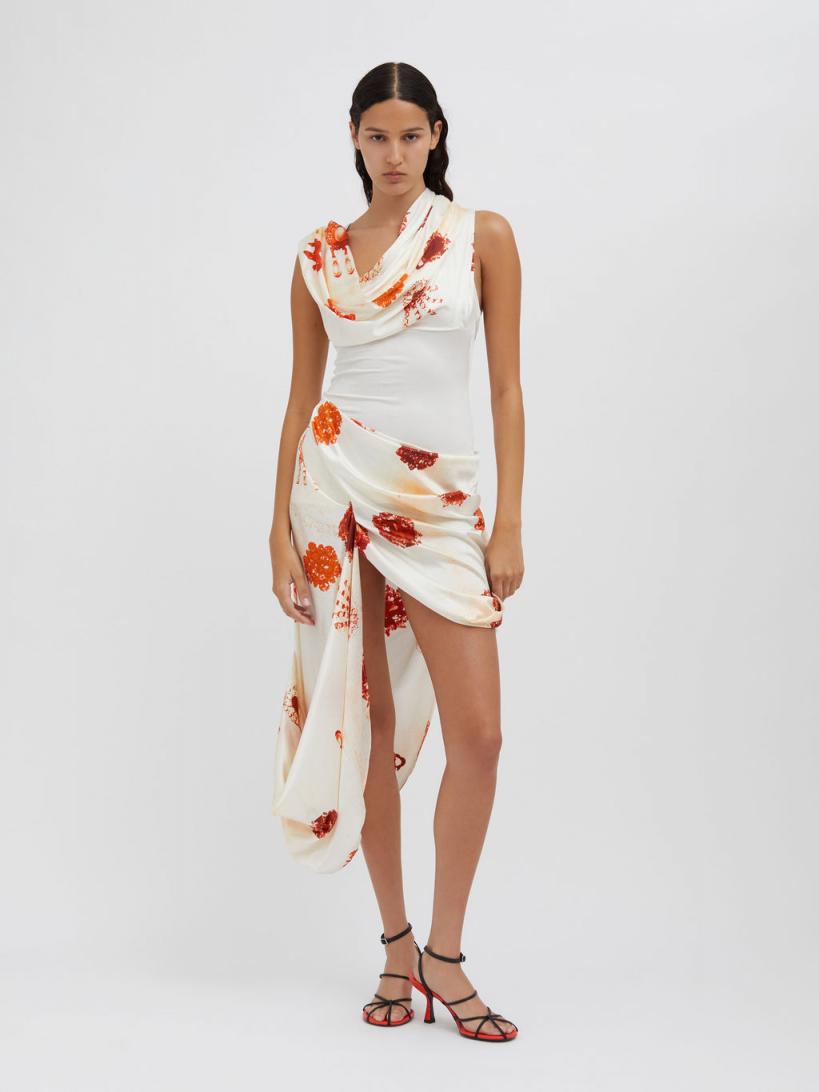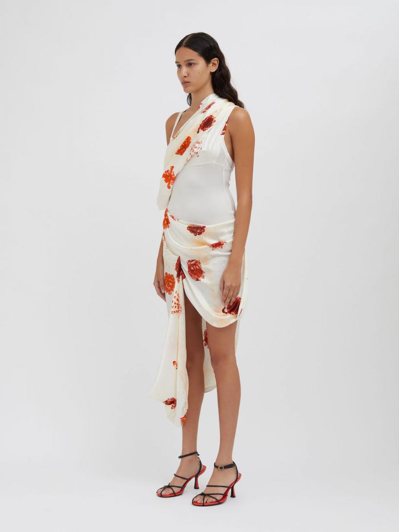 Gestural draping evolves to form around the body in this animated mini dress. Cut in a bespoke Heirloom print stretch silk – a trompe-l’oeil relic is developed by cyanotype photography, eliciting the feeling of memory, a premonition of the past. Asymmetrical high-low silhouette Draped shawl neckline offers multi wear Soft pleating meets to form at the hip Anchored by a fine ribbed tank bodysuit Narrow straps Bespoke heirloom print developed by cyanotype photography Trompe l’oeil forms of passed down jewellery Main: 95% Silk 5% Elastane Contrast: 95% Viscose 5% ElastaneScarlett is 175cm/5’8.5” & wears size AU 8 (US 4)AU sizing