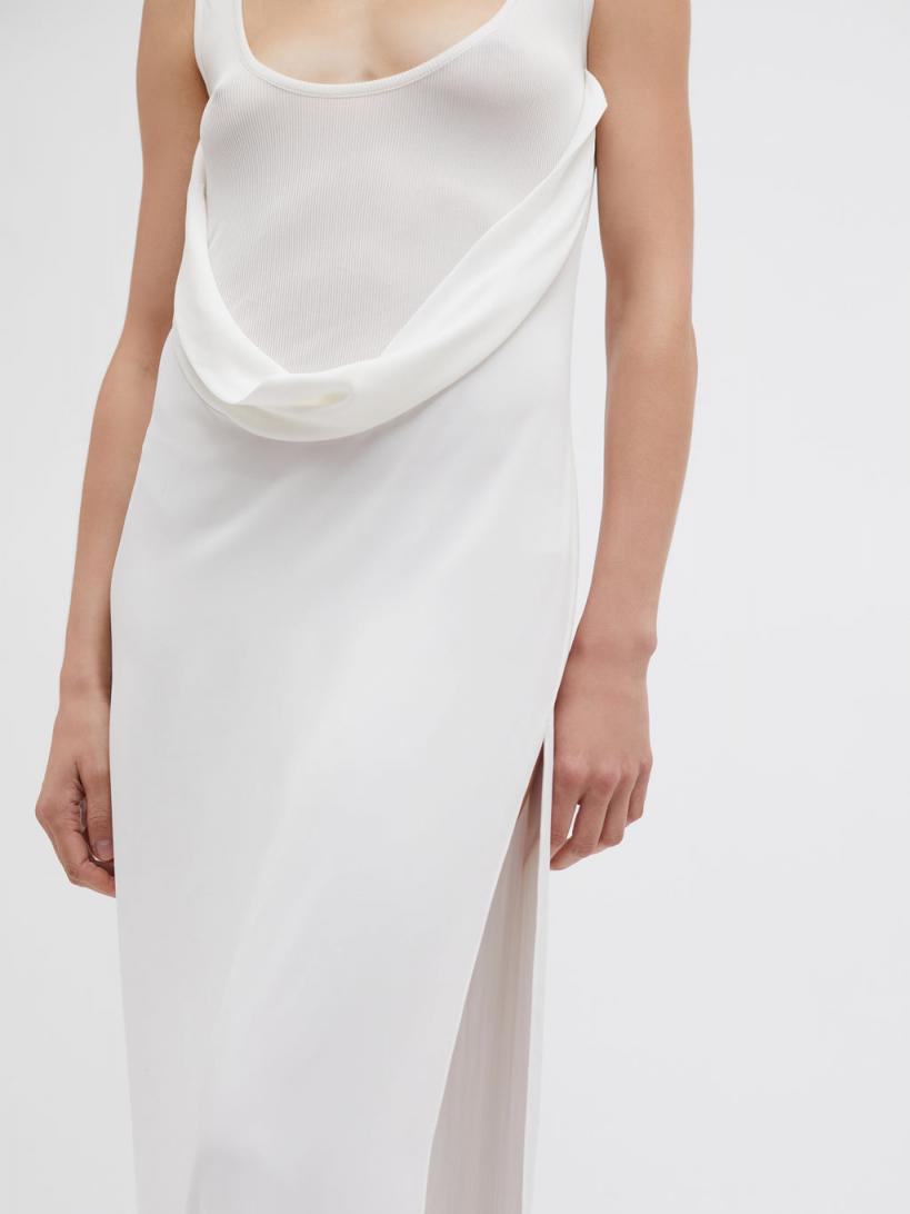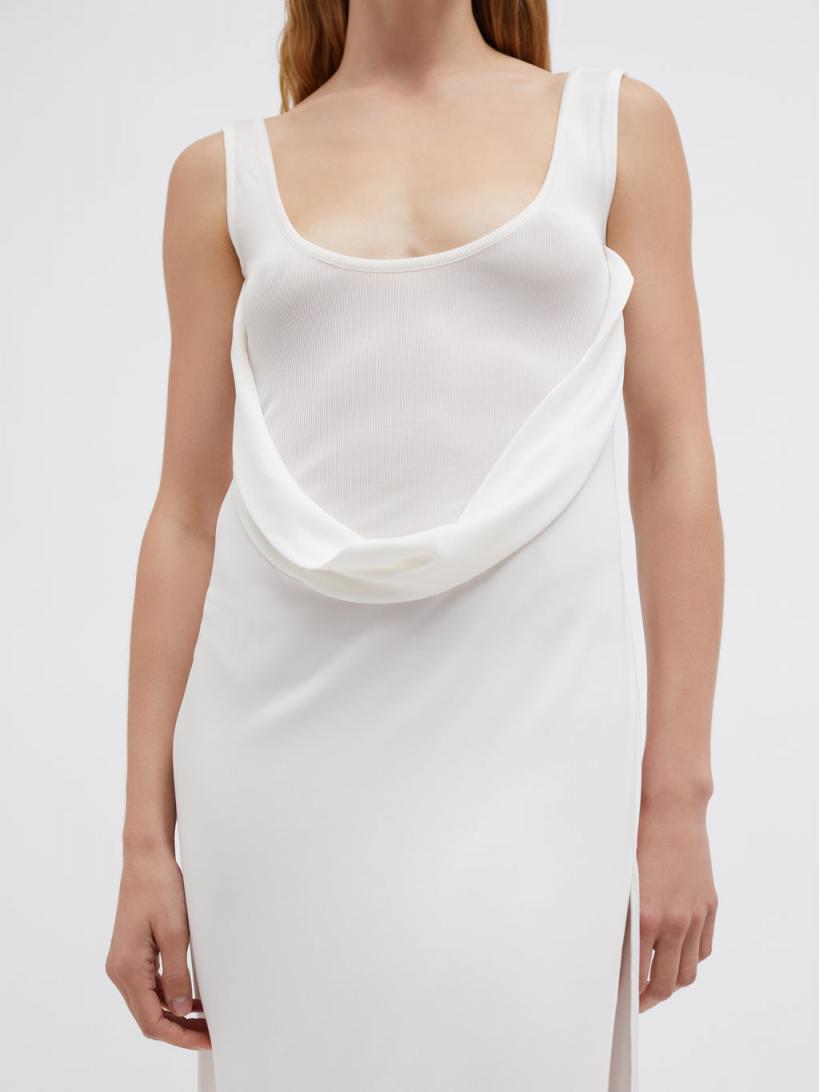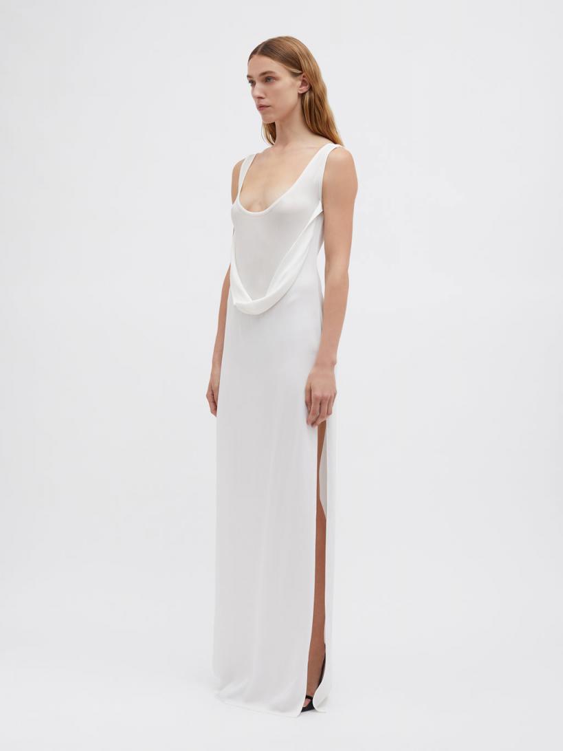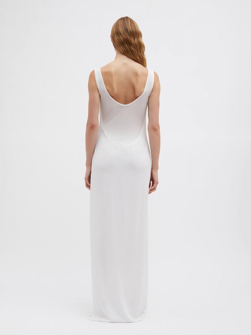 97% Viscose 3% Spandex, 95% Viscose 5% Elastane Sheer rib upper Scoop neckline Draped torso detailing Side slit Full length hem True to size Dry clean only Linnea wears a size 6 AusHeight 175cm/5”9”Bust 81cm/32”Waist 61cm/24”Hips 86cm/34”