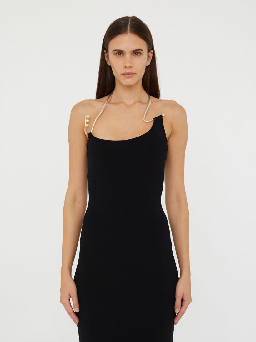 A sleek sculpted knit maxi dress suspended with bespoke metal hardware that hooks around the neckline. Adorned with freshwater pearls. Bespoke sculpted hardware Freshwater Pearls Scooped neckline Maxi Dress Form shaping column silhouette Pulls over body 80% Viscose 20% Nylon Hardware: 100% Brass with Freshwater pearls Wioletta is 178cm/5’10” and wears size AU 8 (US 4)AU sizing