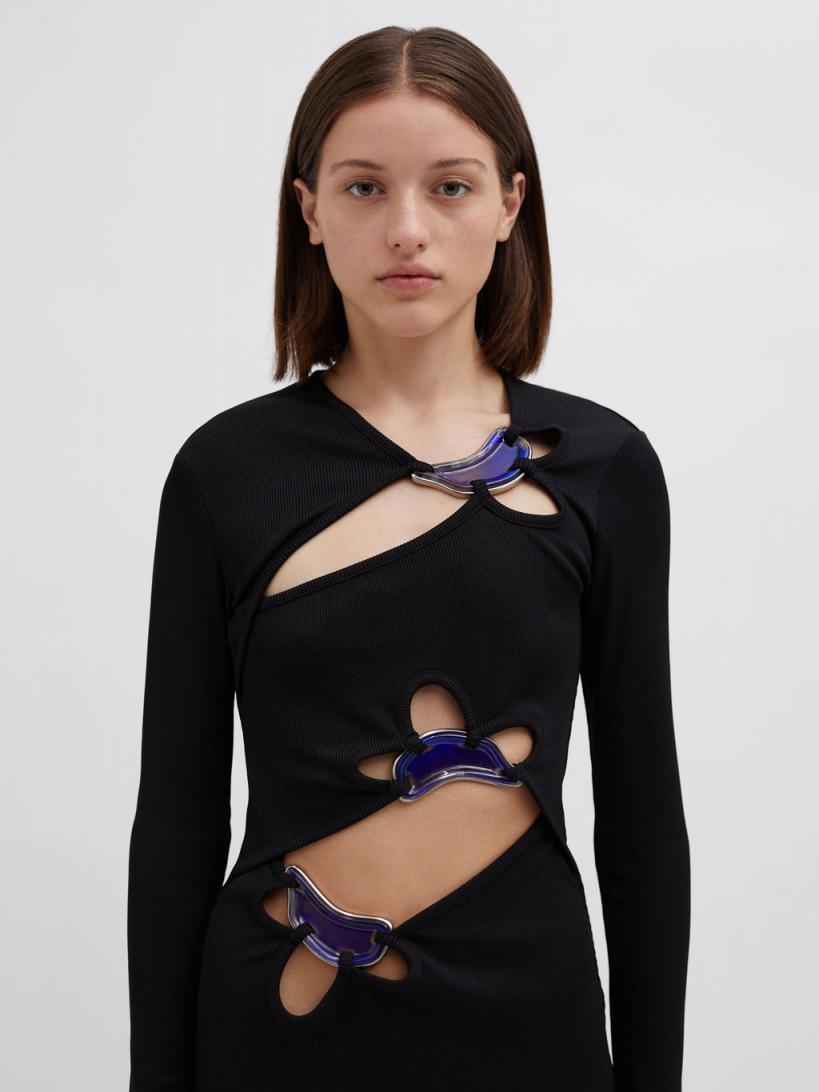 96% Polyester 4% Spandex, 100% Zinc Alloy With Resin Luxe compact rib Pullover silhouette Handcrafted Moodstone hardware Signature Christopher Esber cut out detailing Slim fit True to size Dry clean only The Moodstone changes colour in response to body temperature and offers insight into the wearer’s state of mind and inner feelings. Sophia wears a size 8 AusHeight 178cm/5”10”