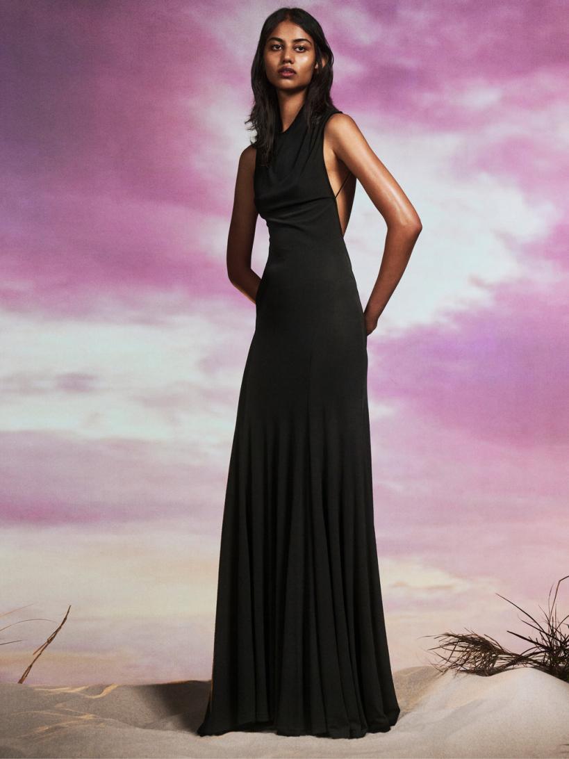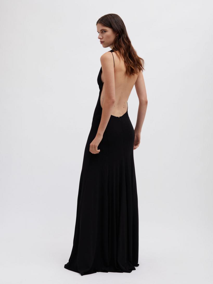 100% Viscose Luxe dry jersey High neckline Open back detail Full length silhouette Flared Hem True to size Dry clean only Liv wears a size 8 ausheight 178cm/5’10” bust 79cm/31″ waist 62cm/24.5″hips 86cm/34”