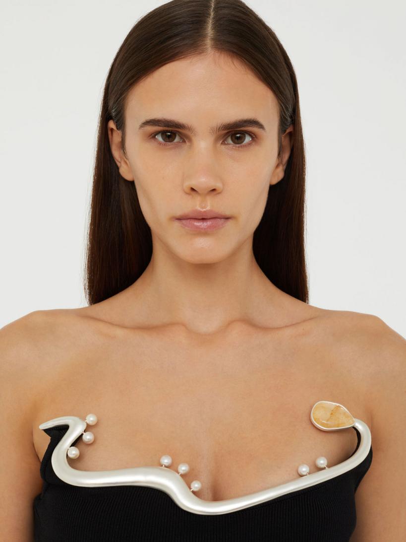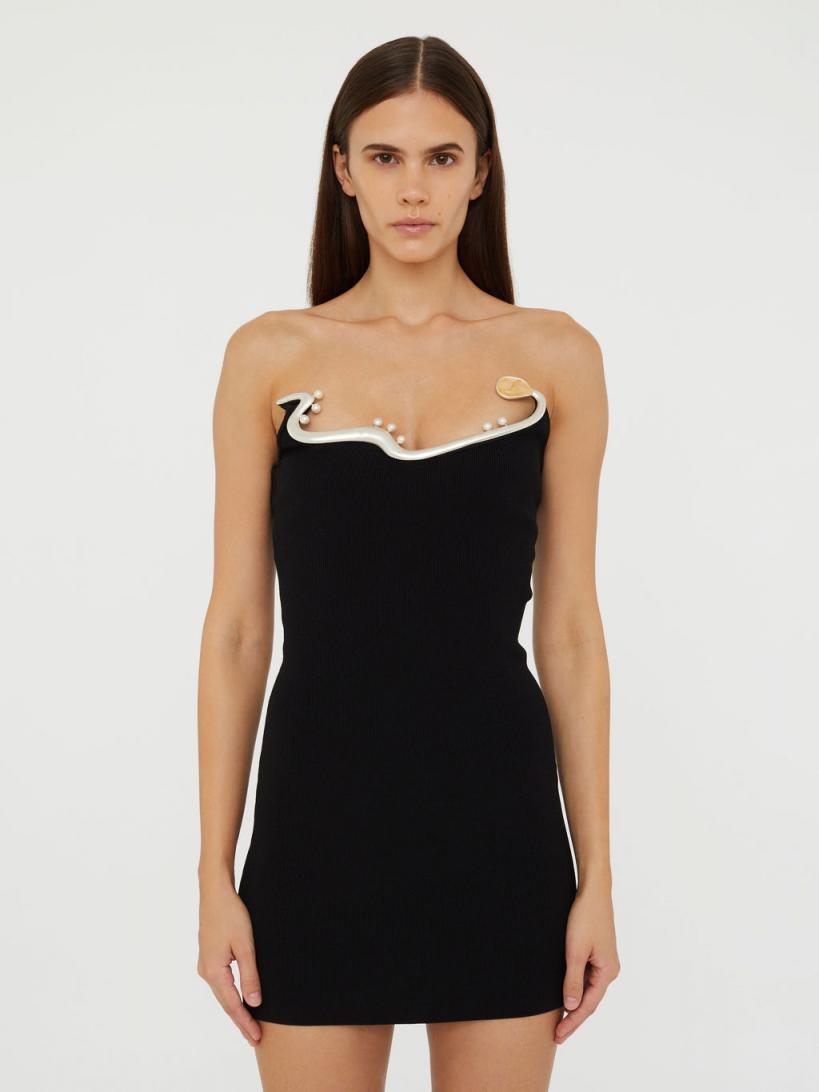 A sleek sculpted rib mini dress hooked with metal hardware and adorned with with pairings of handpicked freshwater pearls. Featuring natural citrine quartz, with properties that enhances spiritual joy, prosperity, and positive thinking. Bespoke mollusk inspired metal hardware Freshwater Pearls Strapless mini dress Finely ribbed for ease of wear Form shaping column silhouette Pulls over body 65% Viscose 35% Nylon Hardware: 100% Brass with Freshwater Pearls and Natural Stone Wioletta is 178cm/5’10” and wears size AU 8 (US 4)AU sizing