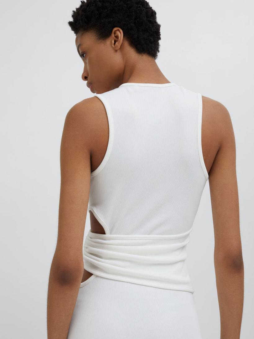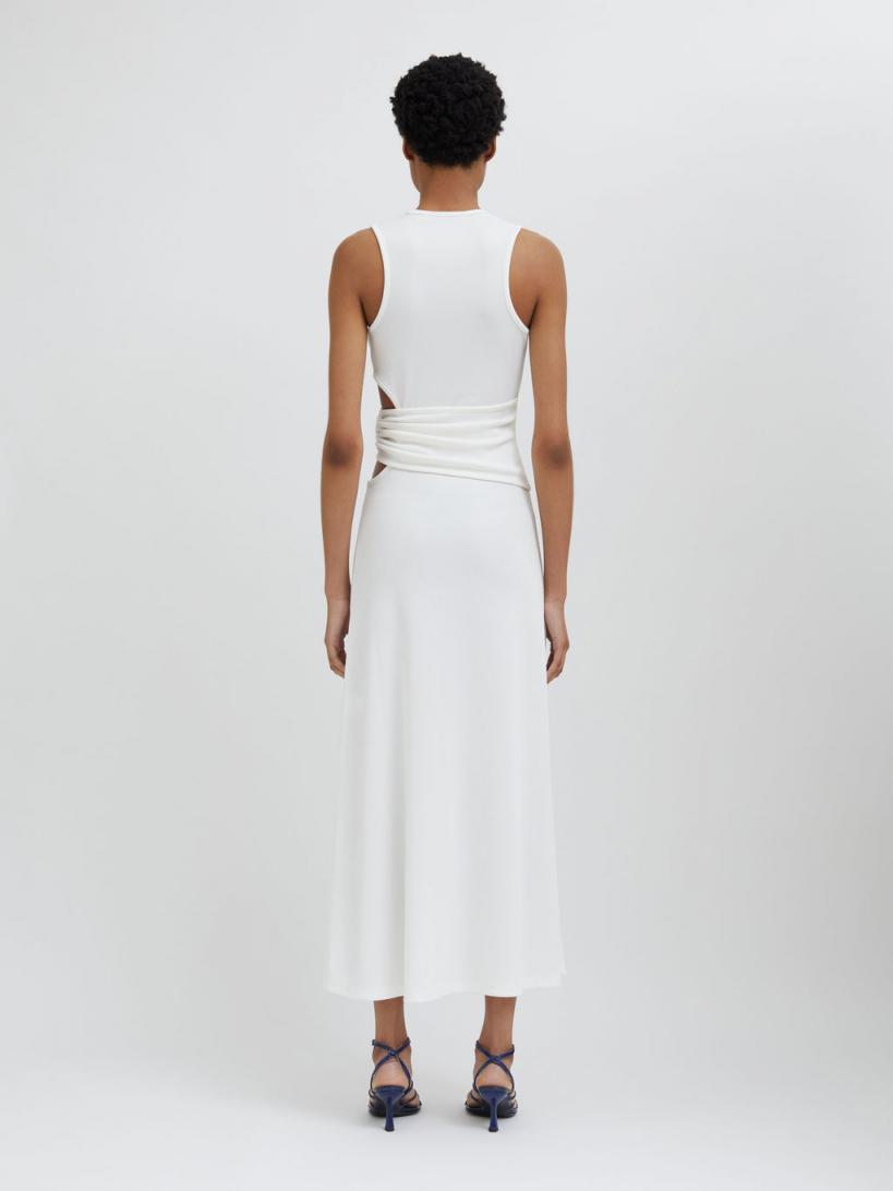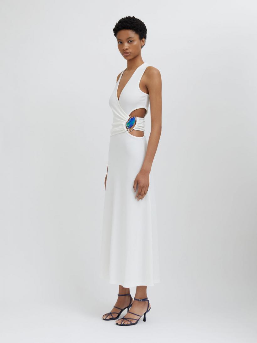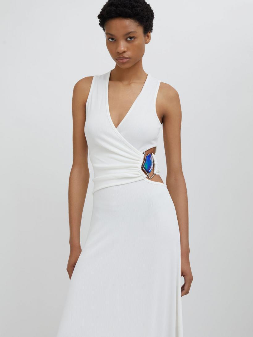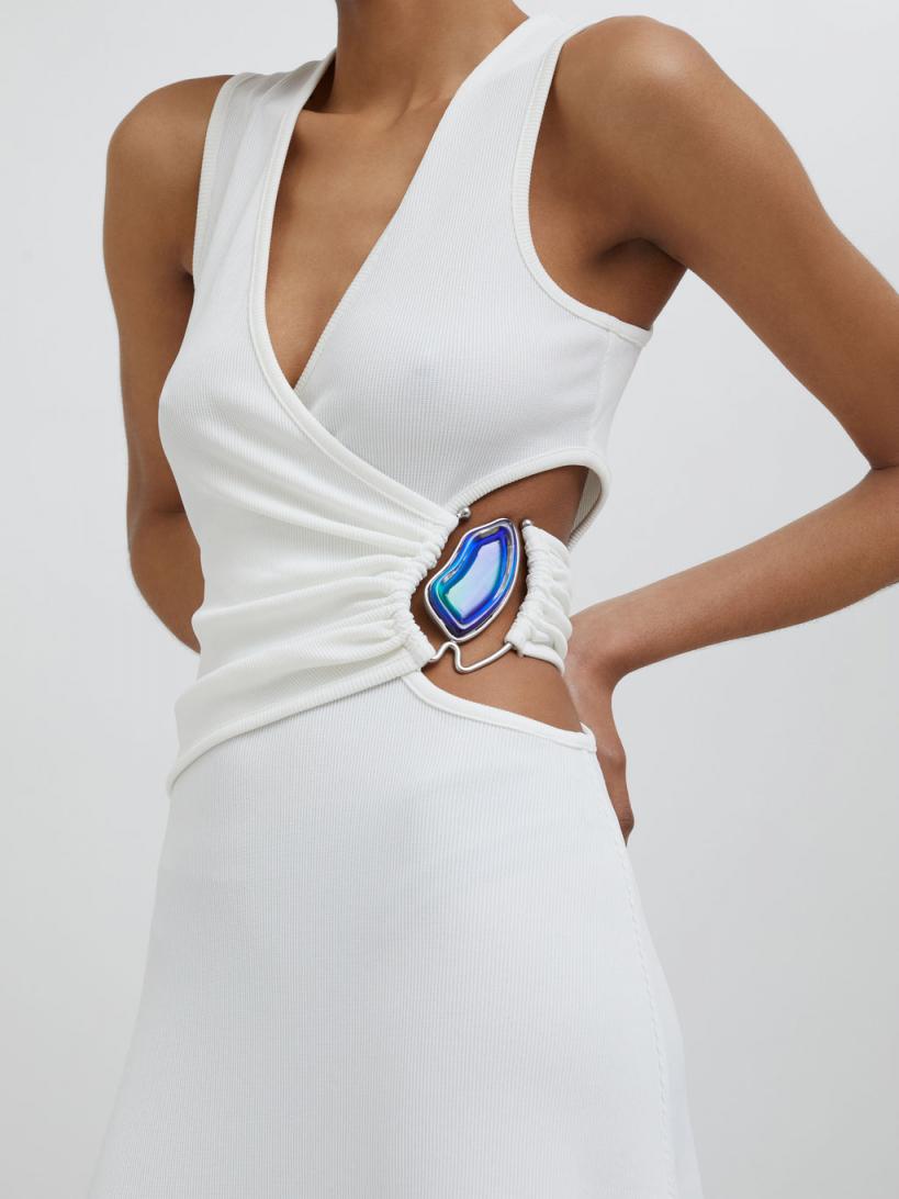 96% Polyester 4% Spandex, 100% Zinc Alloy With Resin Luxe rib weave Hand crafted Moodstone hardware Signature Christopher Esber cut out detailing Flared hem Slim fit Dry clean only The Moodstone changes colour in response to body temperature and offers insight into the wearer’s state of mind and inner feelings. Alyssa wears a size 8 AusHeight 178cm/5”10”