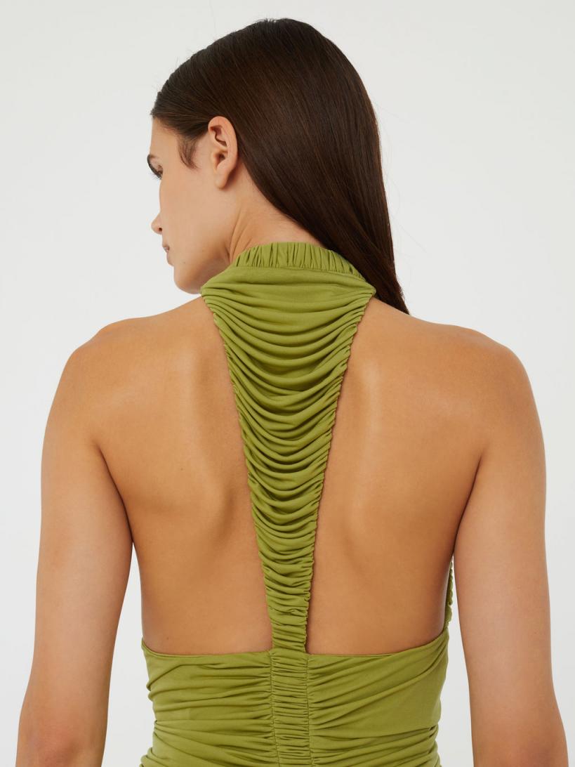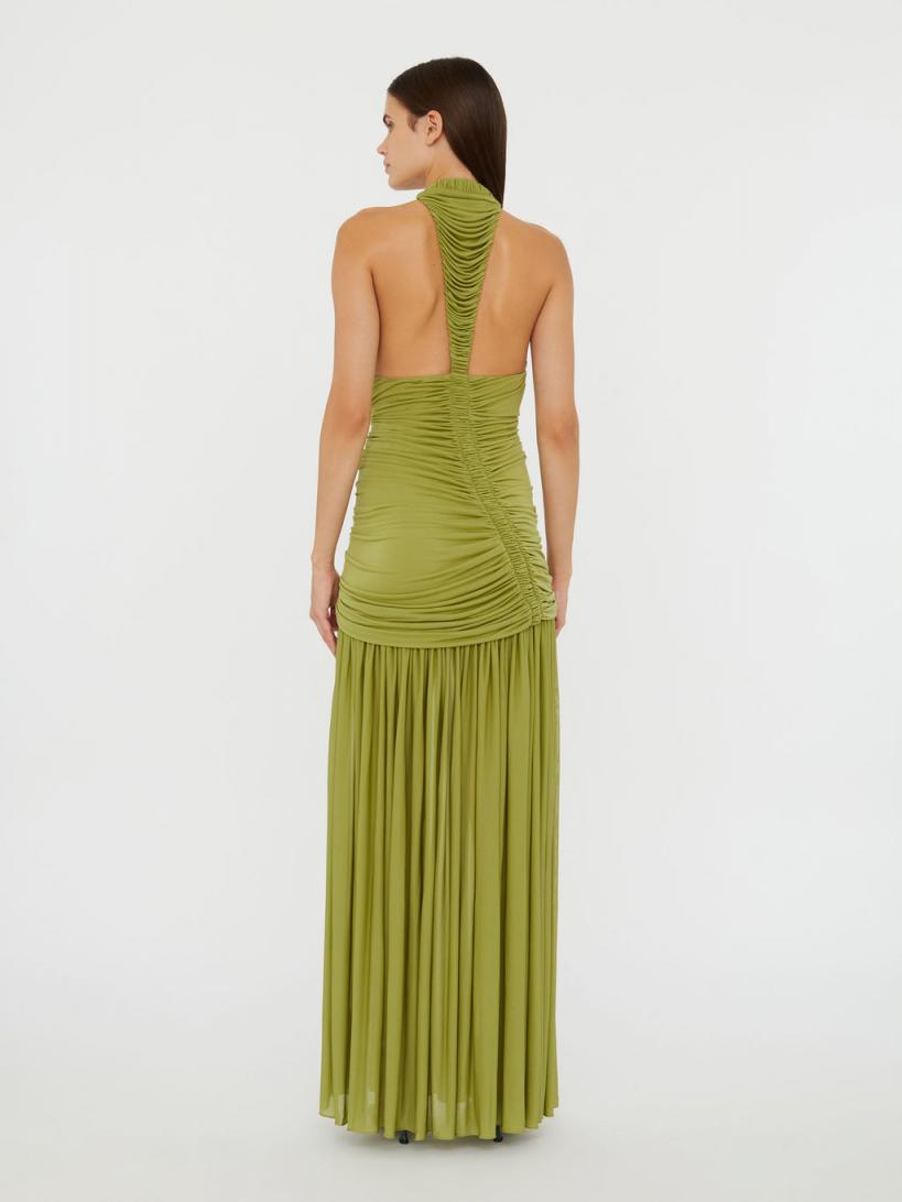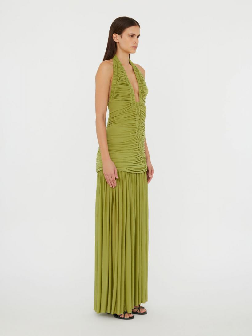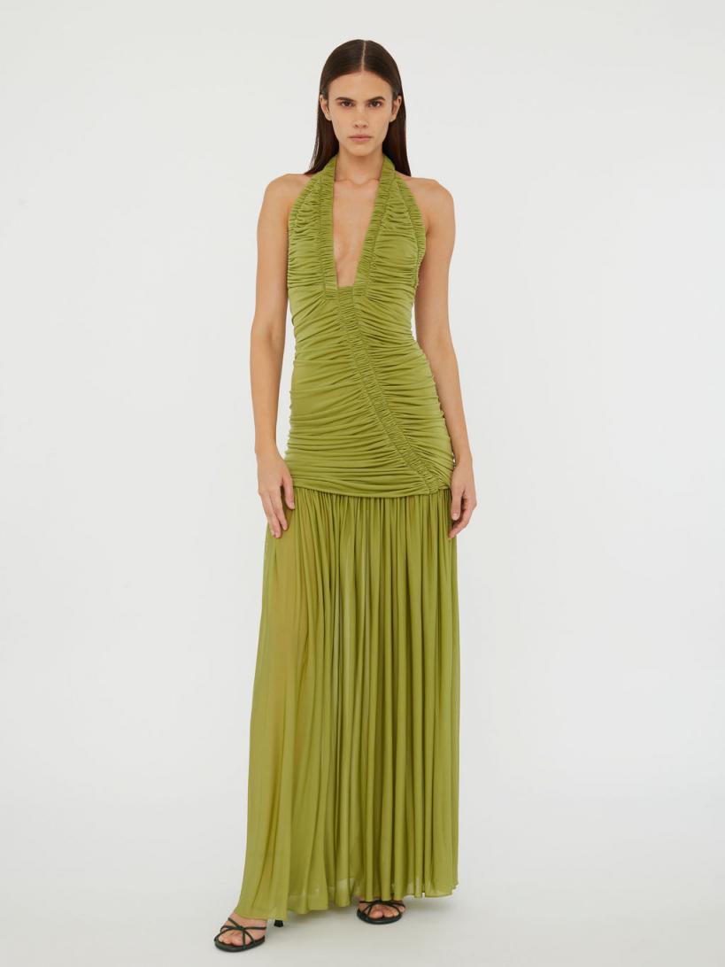 Grafted with free forming line, this richly textured gown is animated by hand sculpted pleats that trace its plunging v neckline and racerback straps. Plunging V neckline Racerback inspired halter straps Hand sculpted ruching Drop-waist maxi silhouette Pleated full skirt Fitted bodice True to size 71% Rayon 29% Polyester Amélie is 180cm/5’11” and wears size AU 8 (US 4)AU sizing