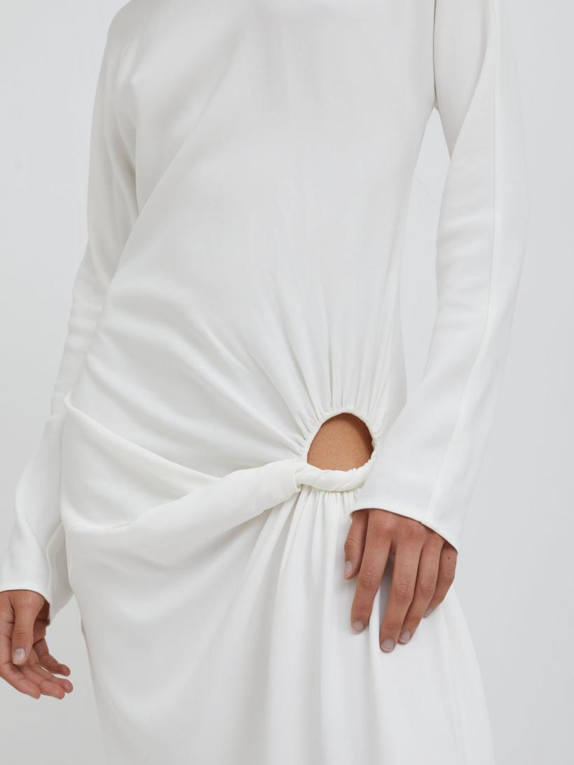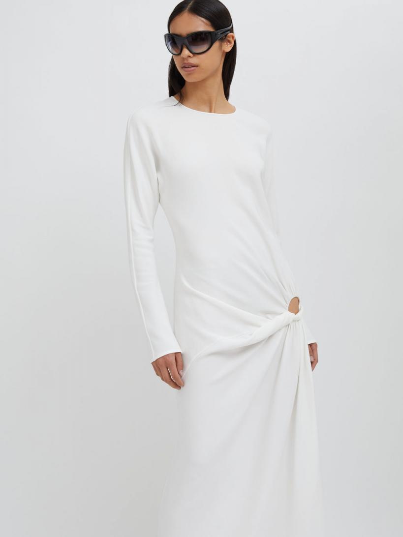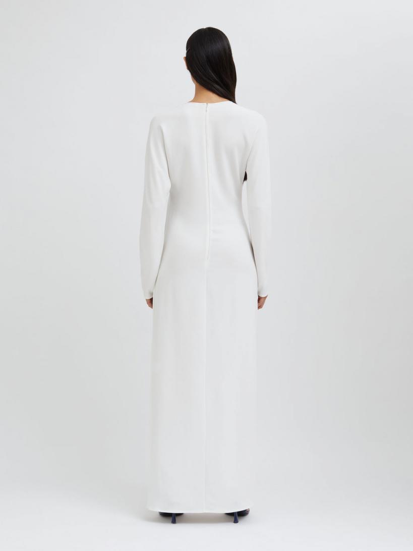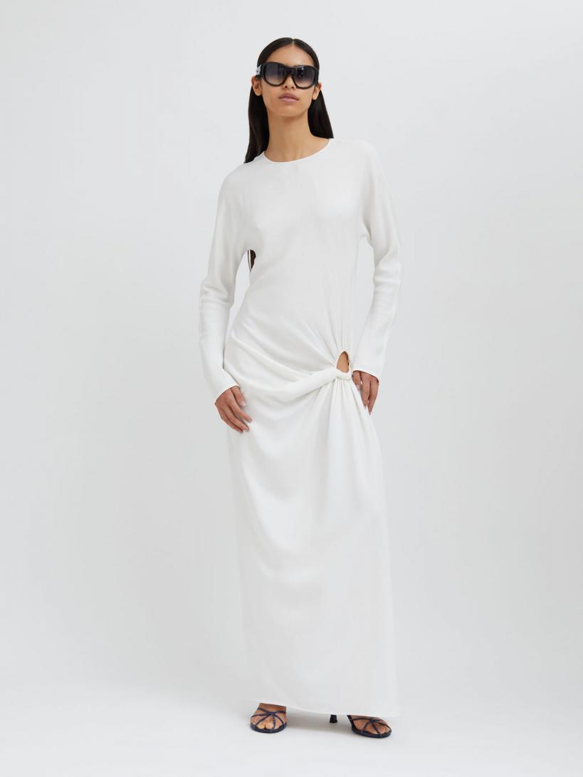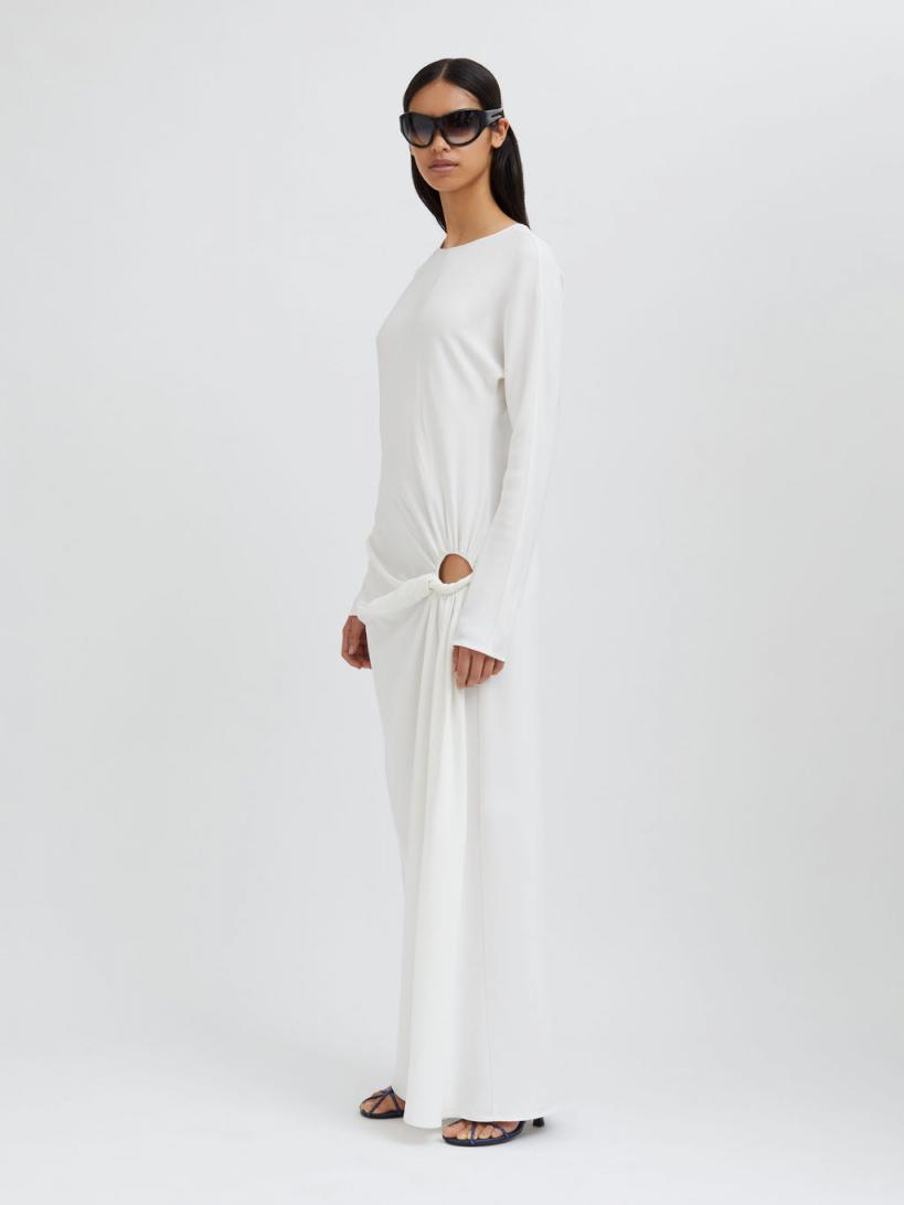Exploring the tension between fragility and strength. A long sleeve maxi dress accentuated by low-slung draping that twists and exposes across the hip. Modest low hip cut-out to one side Hand twisted drape detailing creates movement Easy fitting straight maxi straight silhouette Long relaxed sleeves High round neckline Centre back invisible zip closure Side split skirt 97% Viscose 3% Spandex Sarah is 175cm/5’8.5” & wears size AU 8 (US 4)AU sizing