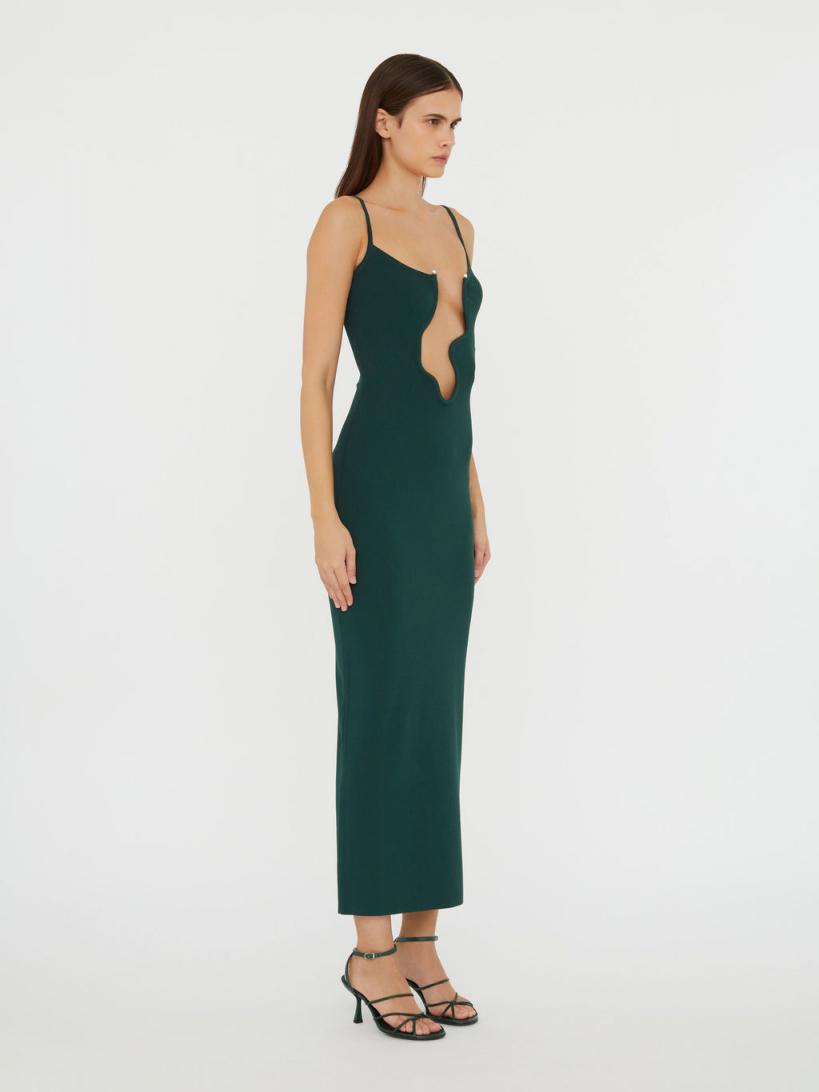 Our signature compact rib fabrication is grafted with free forming line with this sculpted wire cut-out column dress. Finished with pearlescent hardware. Sculpted wire wave formation hardware Full length silhouette Sleeveless with fine built in straps Pull over style True to size 80% Viscose 20% Nylon Hardware: 100% Zinc Amélie is 180cm/5’11” and wears size AU 8 (US 4)AU sizing