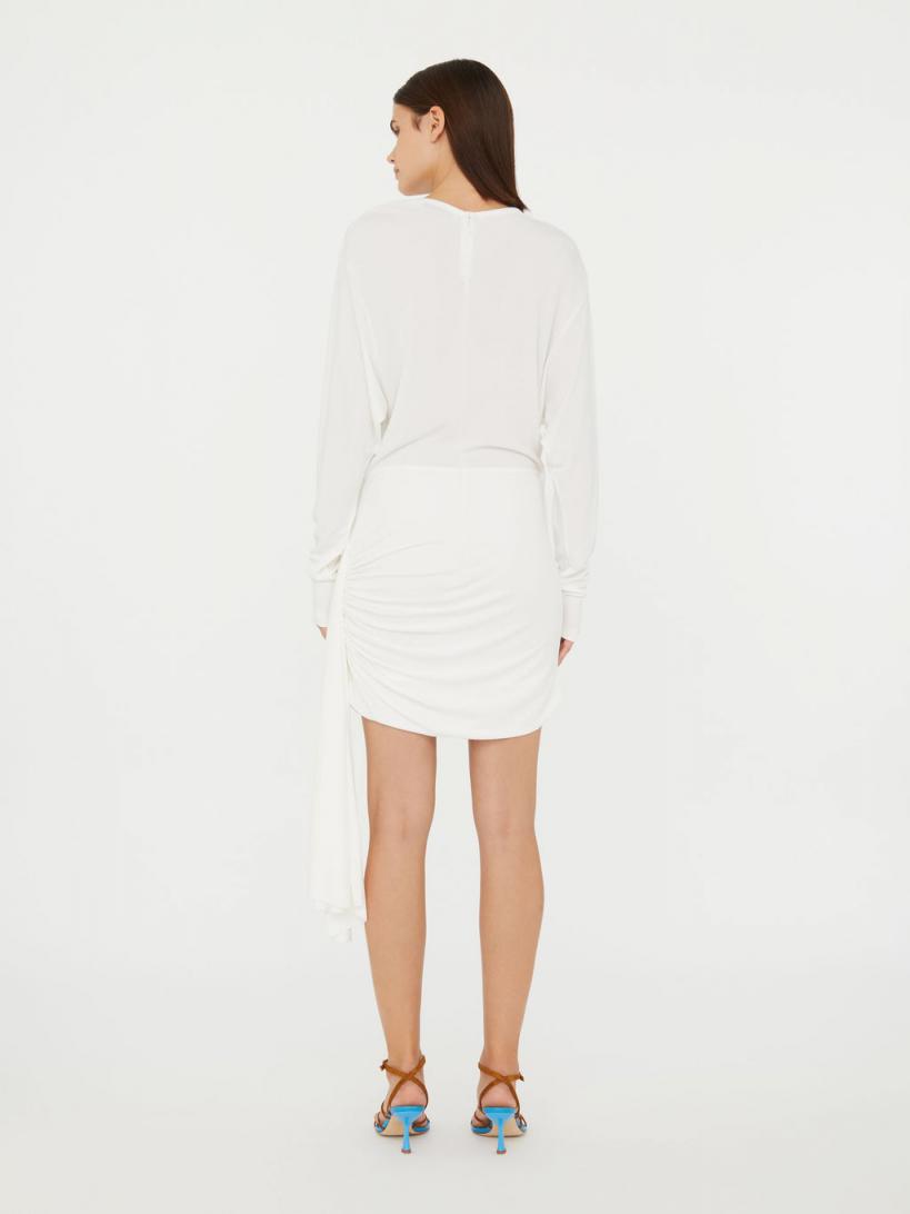 Made from signature draped jersey, this long sleeve mini dress intentionally drapes across the hip with fluidity. Featuring a cascading panel that appears to fall away from the body. Side cowl draped waist Signature dry jersey fabrication Fitted skirt Exaggerated and relaxed long sleeve Invisible zip closure True to size 100% Viscose Amélie is 180cm/5’11” and wears size AU 8 (US 4)AU sizing