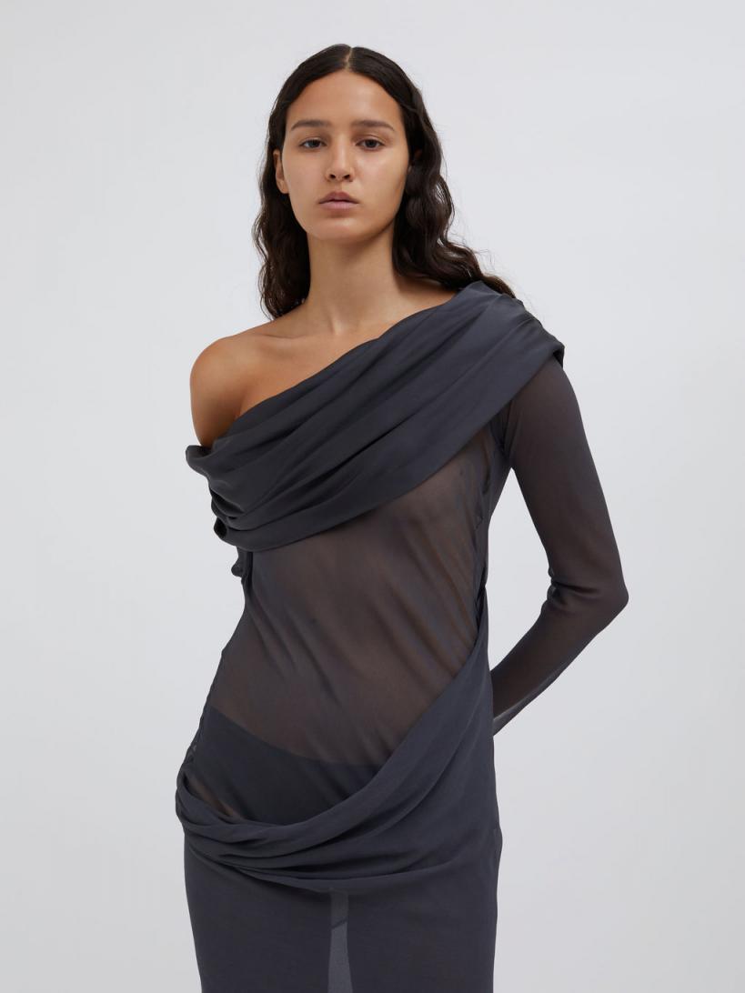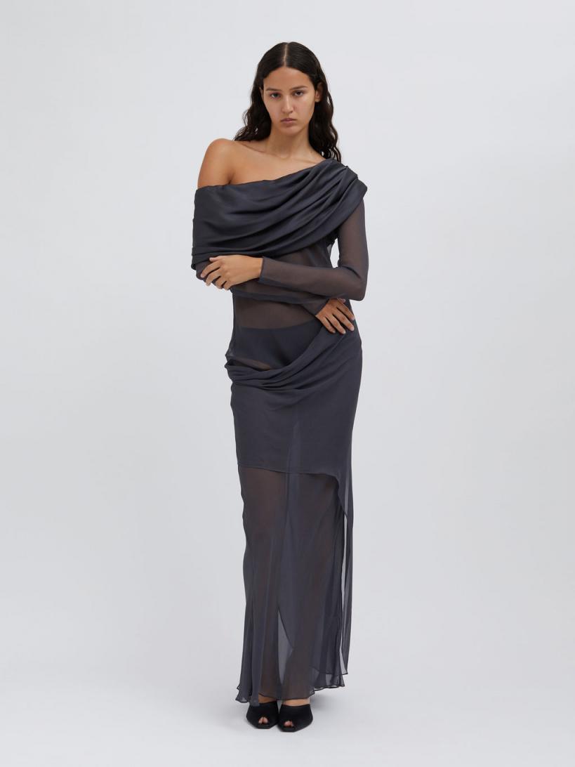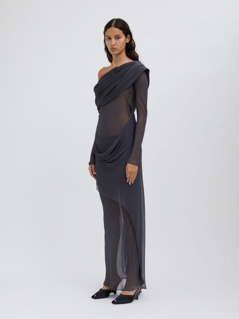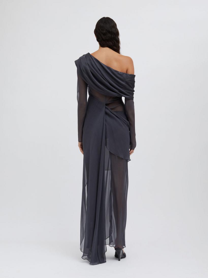 Blending structure and sensuality, sheer silk georgette is intentionally draped across the shoulders and hip, with a layered train at the back which appears to fall away from the body. Long sleeve maxi silhouette Ruching at shoulder & hips Washed Silk Georgette Unlined Sheer torso True to size 100% SilkScarlett is 175cm/5’8.5” & wears size AU 8 (US 4)AU sizing