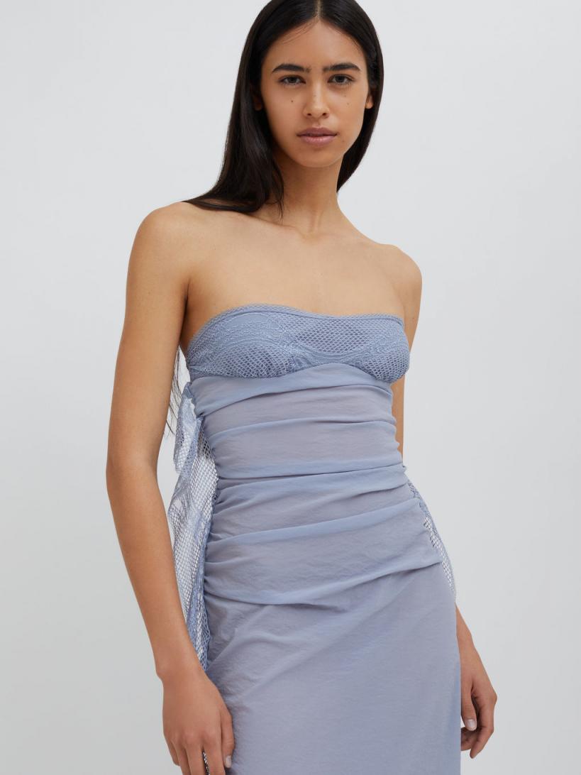A crisp paper-like strapless dress revitalises a classic column silhouette. Traced in bespoke vintage inspired wave lace, collected over decades in a convergence of past and present. Bespoke vintage inspired lace trim Layered lace trimming that trace the edges Cut in lightweight paper-like woven fabrication Back elongated lace tie Strapless column midi silhouette Main: 83% Nylon 17% Polyurethane Lace: 62% Viscose 38% Cotton Sarah is 175cm/5’8.5” & wears size AU 8 (US 4)AU sizing