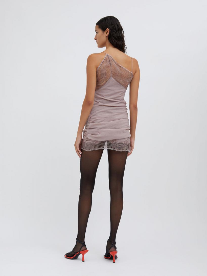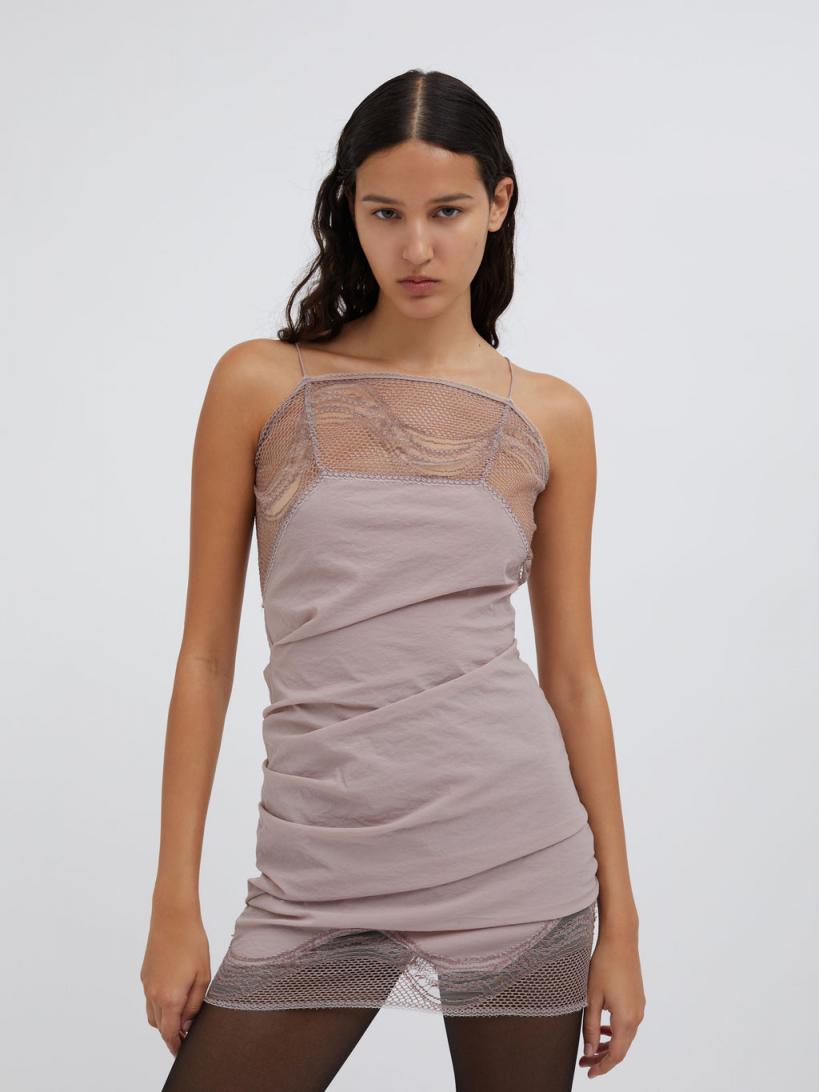 A crisp paper-like cami dress revitalises a classic mini silhouette. Traced in bespoke vintage inspired wave lace, collected over decades in a convergence of past and present. Bespoke vintage-inspired lace collected over decades Straight neckline with peaked back panel Layered lace trimming that trace the edges Cut in lightweight paper-like woven fabrication Gently ruched side seams Sleeveless column mini silhouette Main: 83% Nylon 17% Polyurethane Lace: 62% Viscose 38% CottonScarlett is 175cm/5’8.5” & wears size AU 8 (US 4)AU sizing
