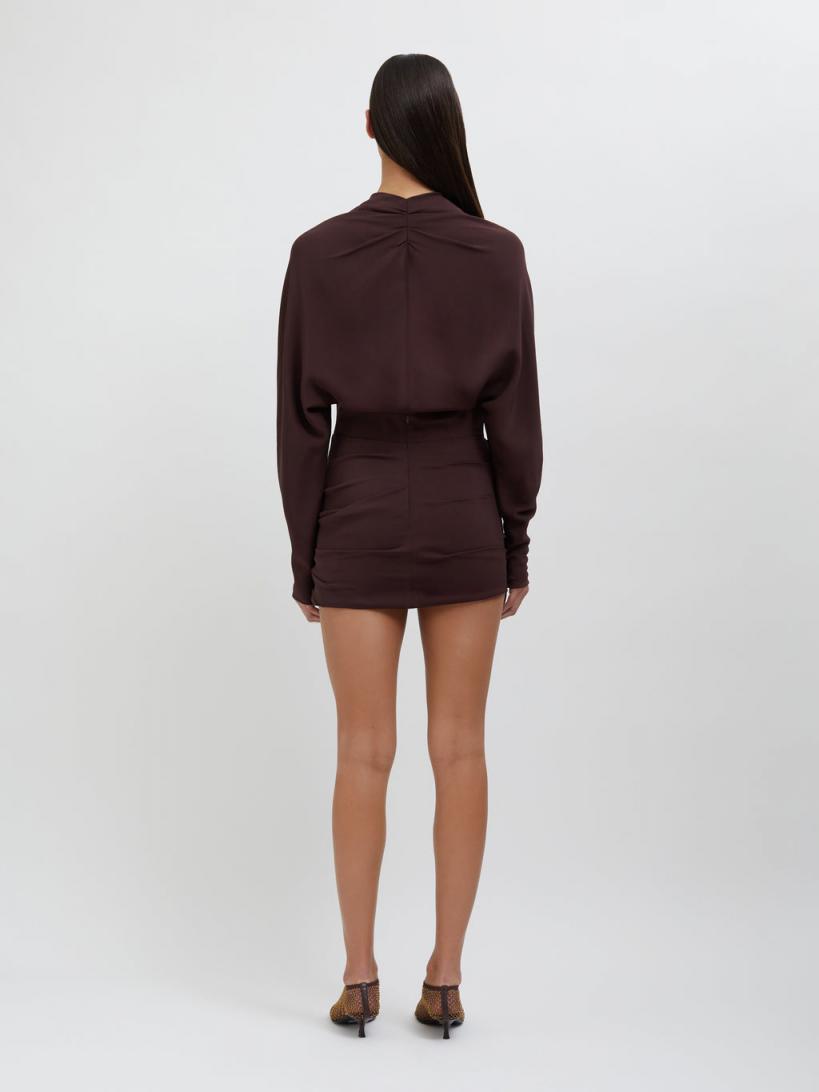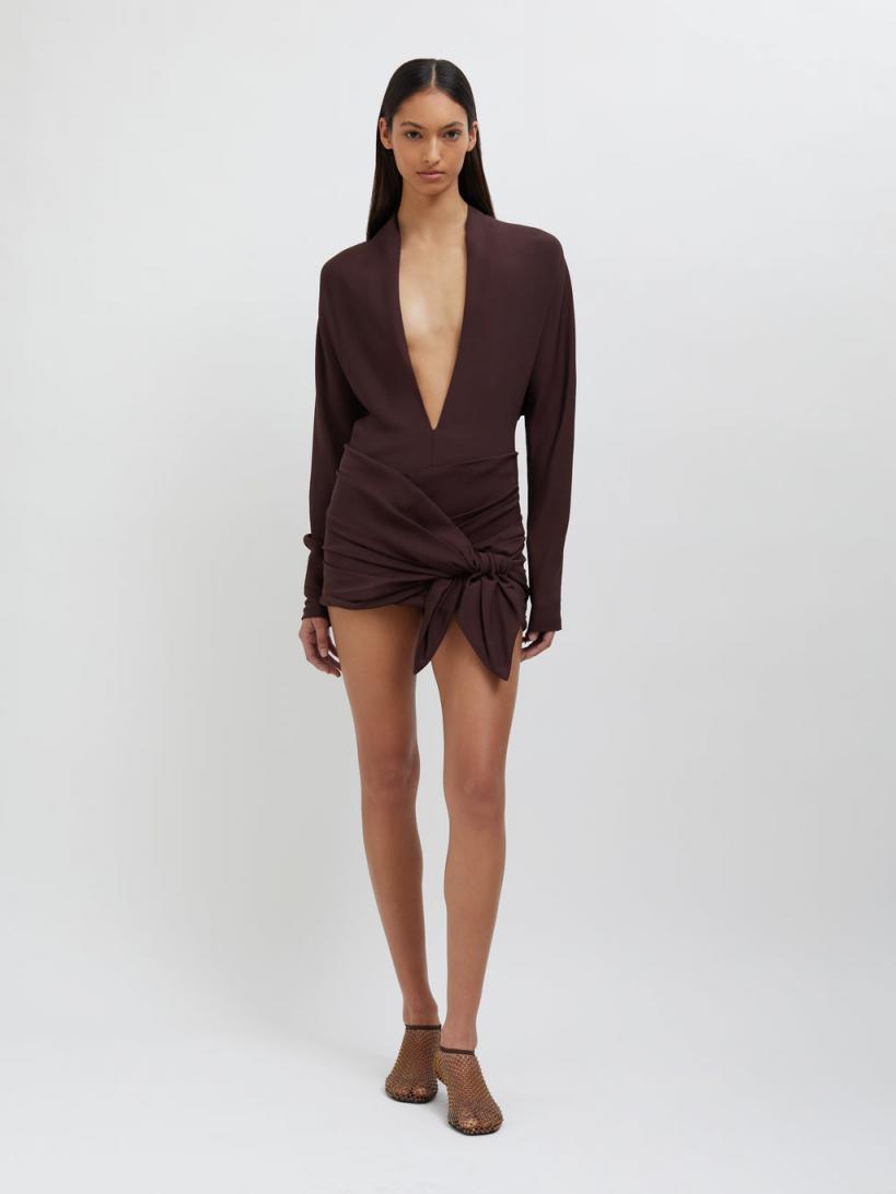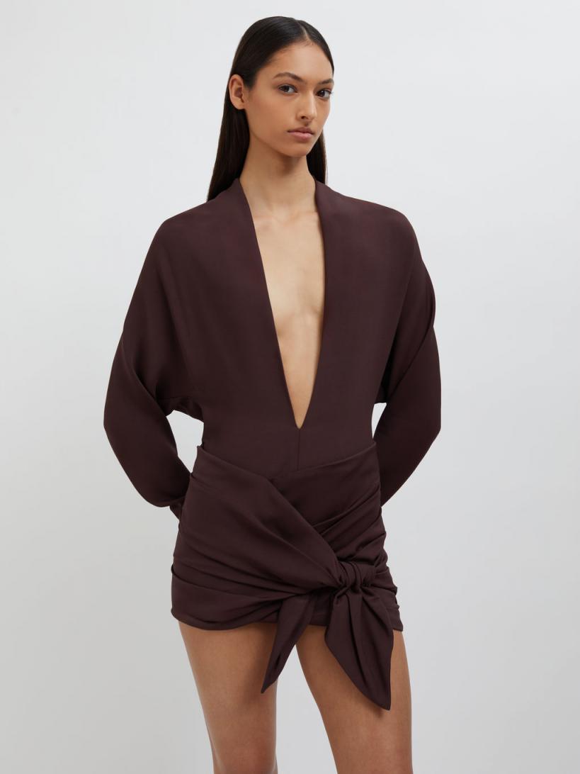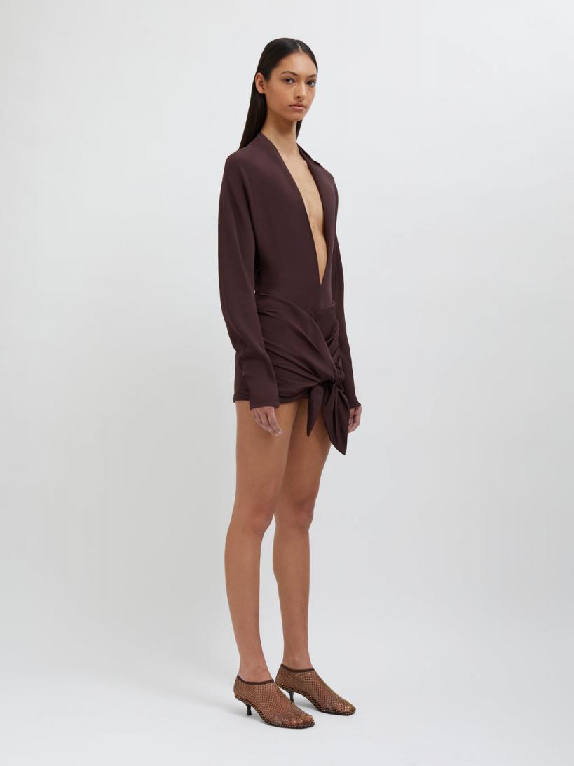Blending structure and sensuality, mahogany viscose is intentionally draped across the hip that folds and ties. Plunging deep at the neckline to hint to the décolletage beneath. Deep plunge v neckline Long Sleeves Mini silhouette Adjustable wrap tie at low hip Invisible zip closure at back 97% Viscose 3% Spandex Lauren is 178cm/5’10.5” & wears size AU 8 (US 4)AU sizing
