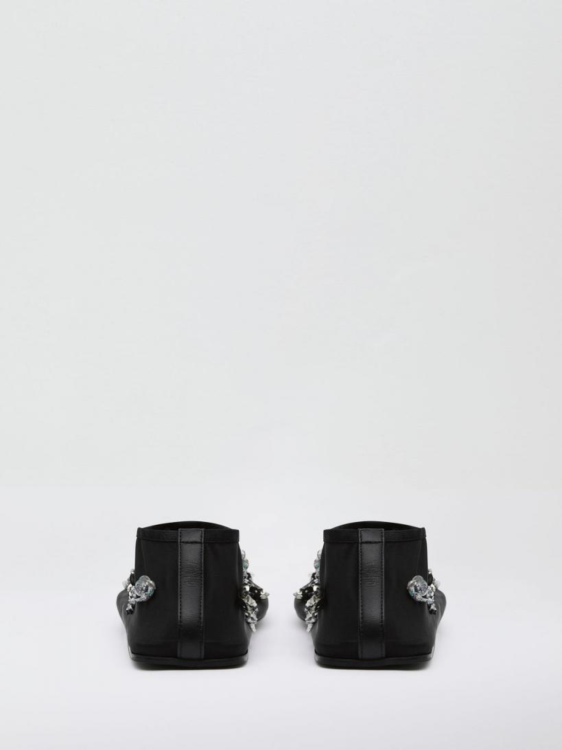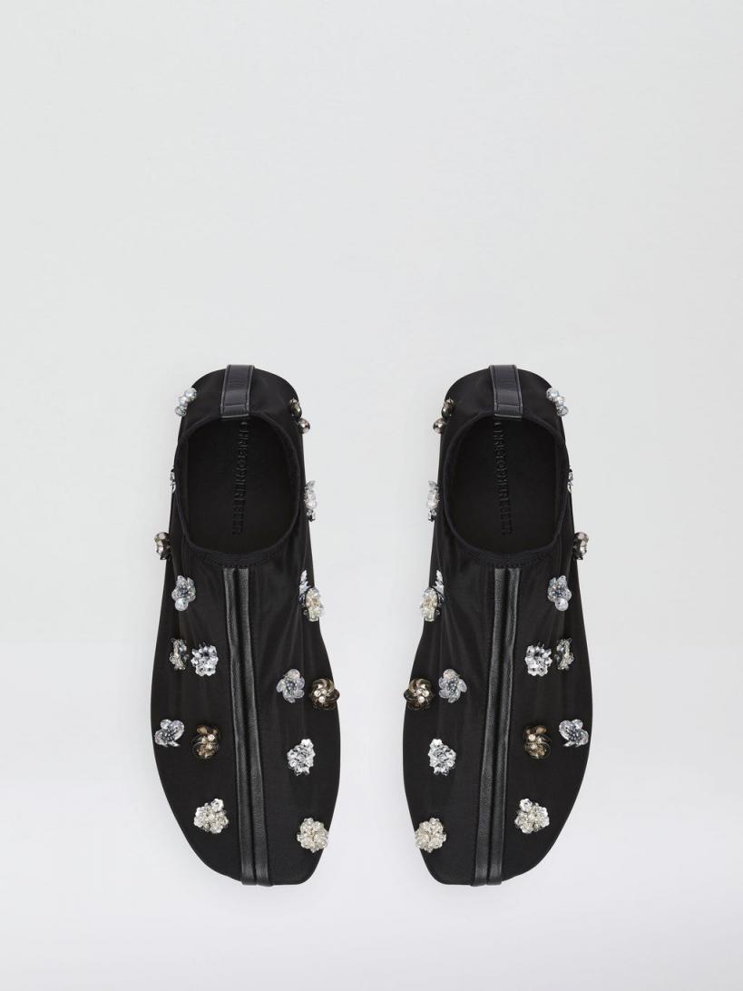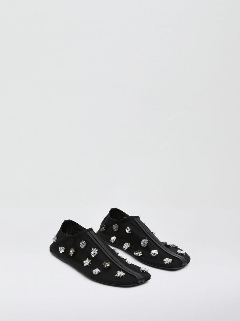 Adorned with glass embellishments that appear as colliding clusters. This sheer slip on flat is crafted in Italy of airy mesh traced by a graphic soft calfskin trim. Crafted in Italy Mesh demi sheer fabrication Soft Leather accent trim Hand embellished glass bead clusters Sock-like slip on silhouette Elasticated ankle opening for ease of wear Upper: 100% Nylon with Glass Beading Sole: 100% Cow Leather Footwear is in IT sizing
