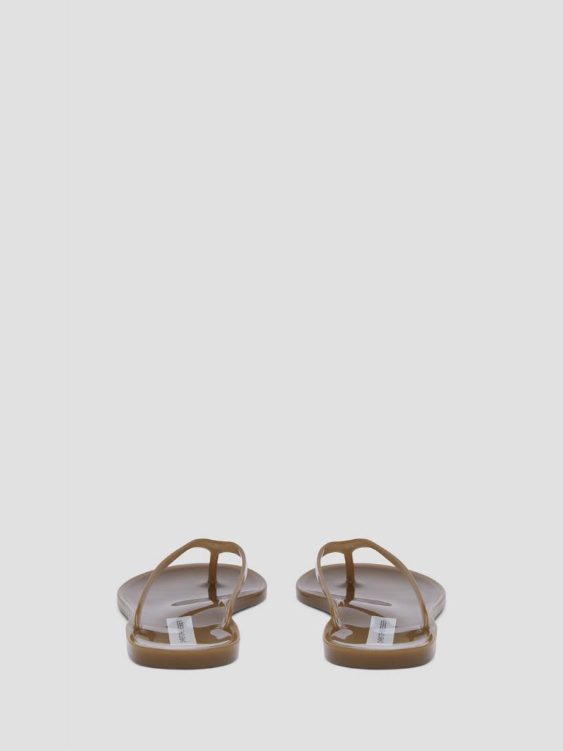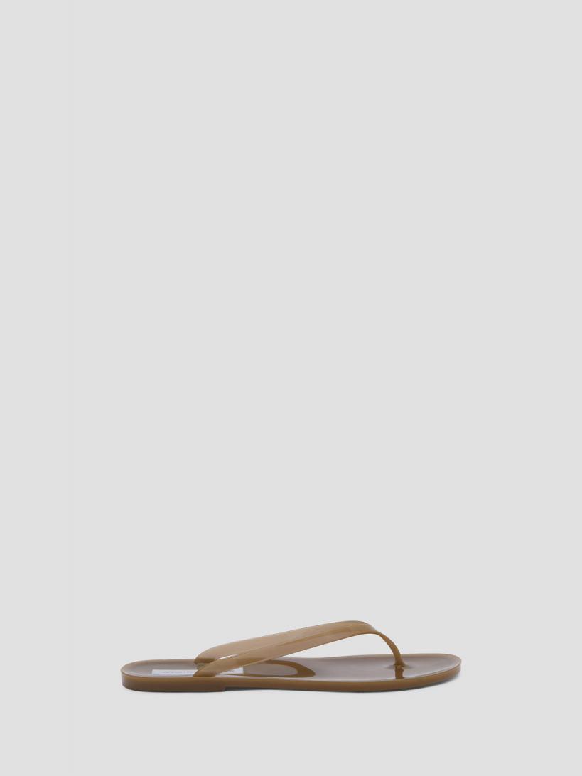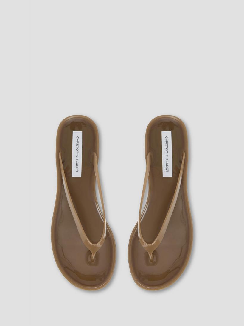 A minimalist cola tone flip flop that slips on with ease. Hand crafted in Italy made in a semi-transparent, jelly-like 100% PVC. Made in Italy Water resistant Jelly-like texture Slip on style 100% PVC Foot wear is IT sizing This piece offers a narrow fit we recommend choosing one size up