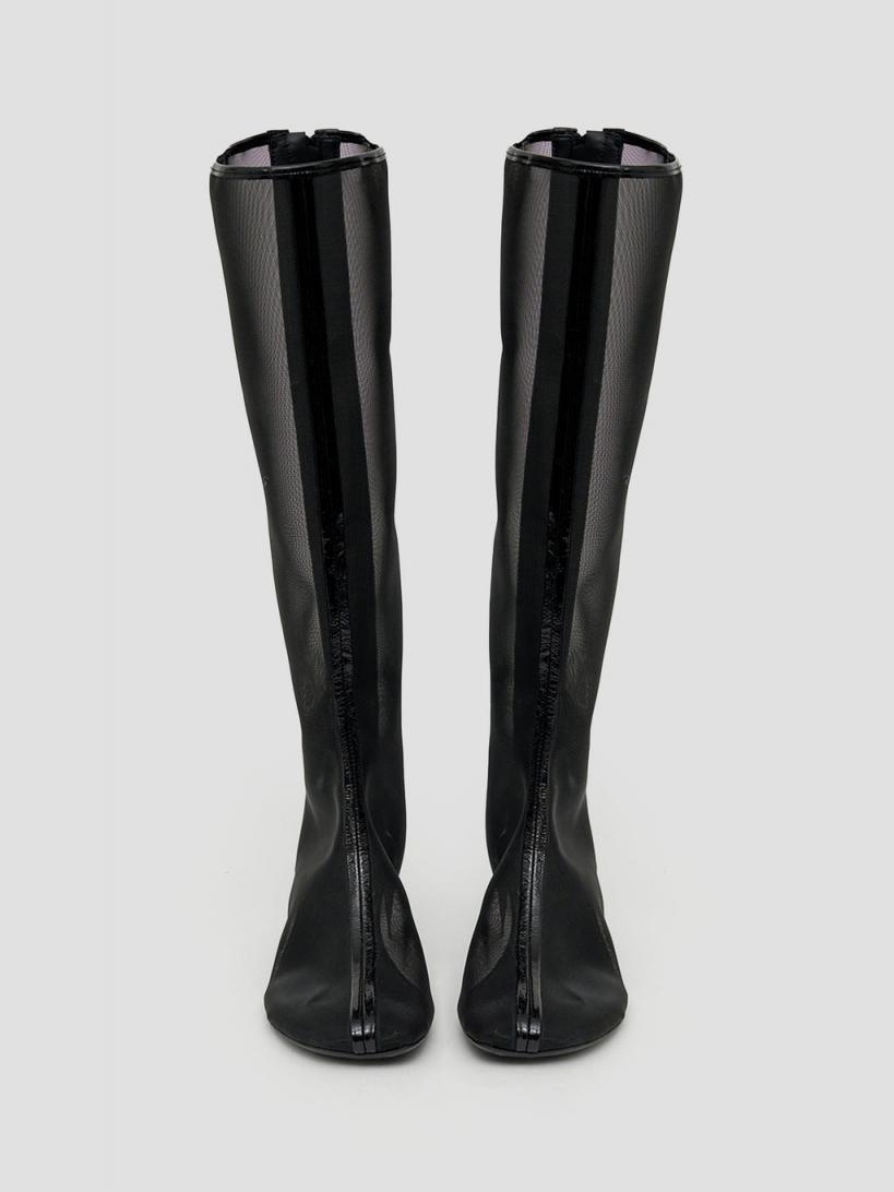 A sheer knee high boot crafted in Italy of airy mesh traced by a graphic soft calfskin trim for dimension. Set atop a 55mm kitten heel, finished with a elongated back zip traced with leather. Crafted in Italy Rounded toe cap Fitted knee high silhouette Mesh demi sheer fabrication Soft Leather accent trim Rubber injection at base of heel Heel Height: 50mm Upper: 100% Nylon Trim: 100% Leather Calf Lining: 100% Leather Cow Nappa Sole: 100% Leather Cow Footwear is in IT sizing