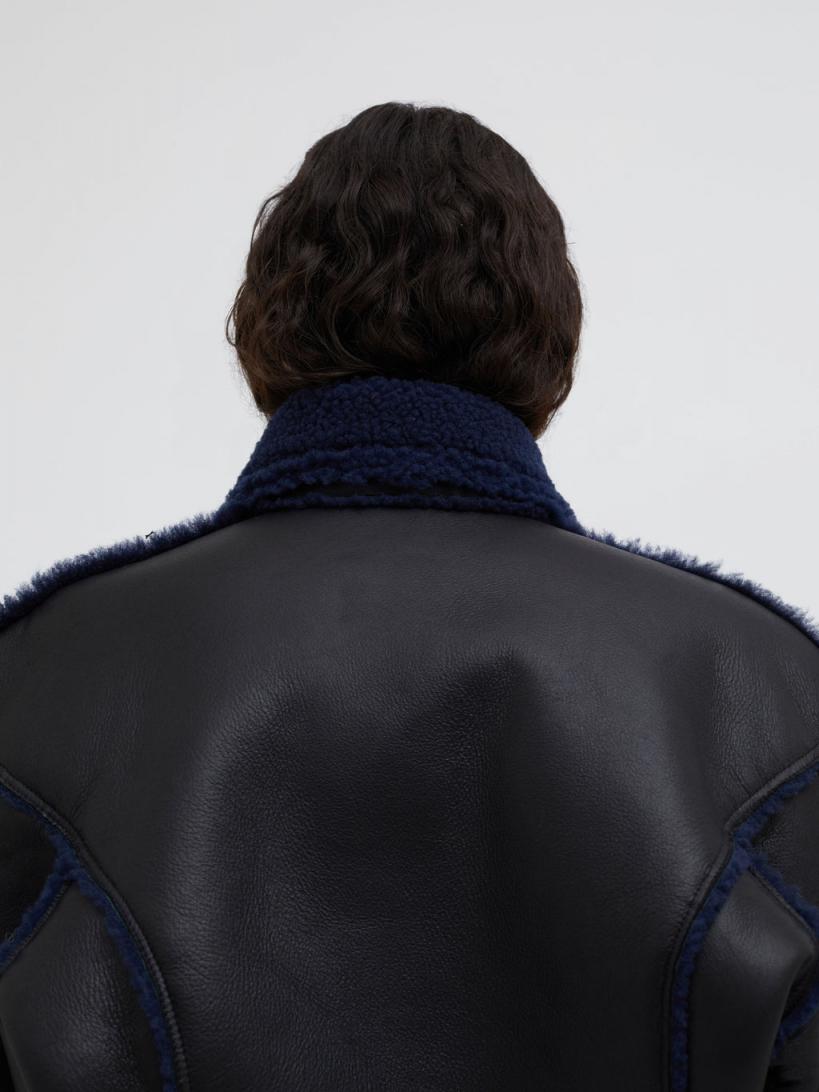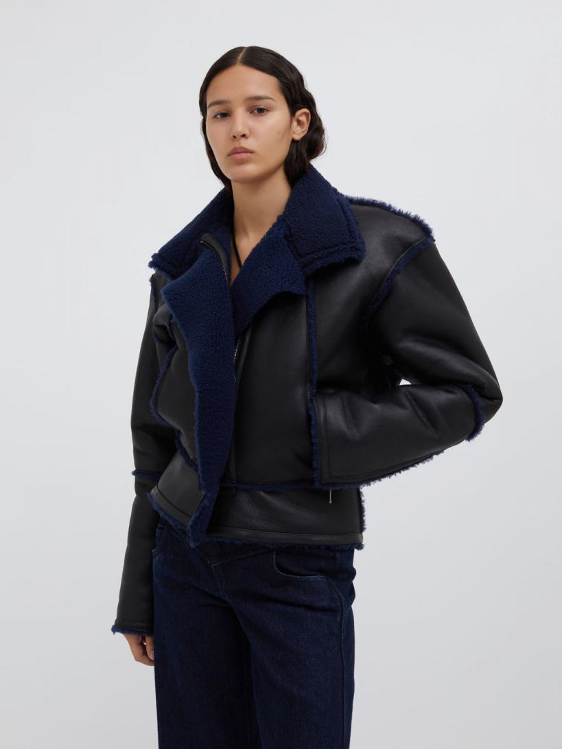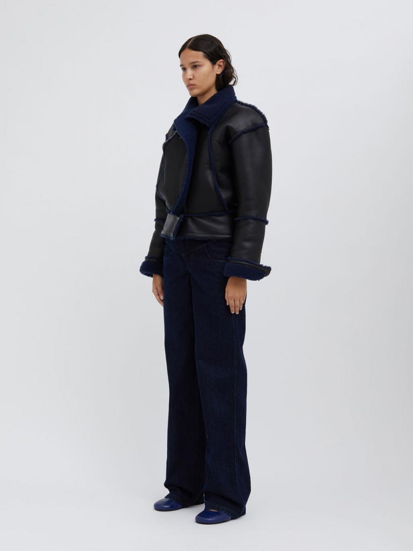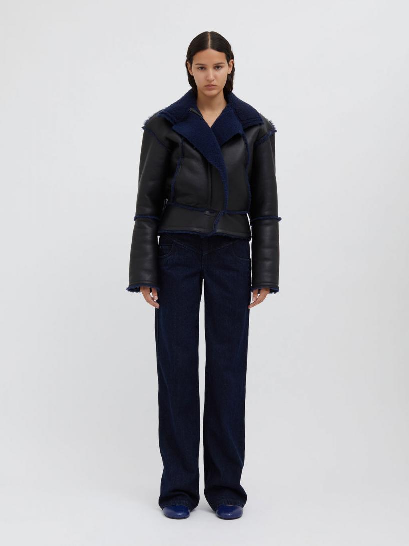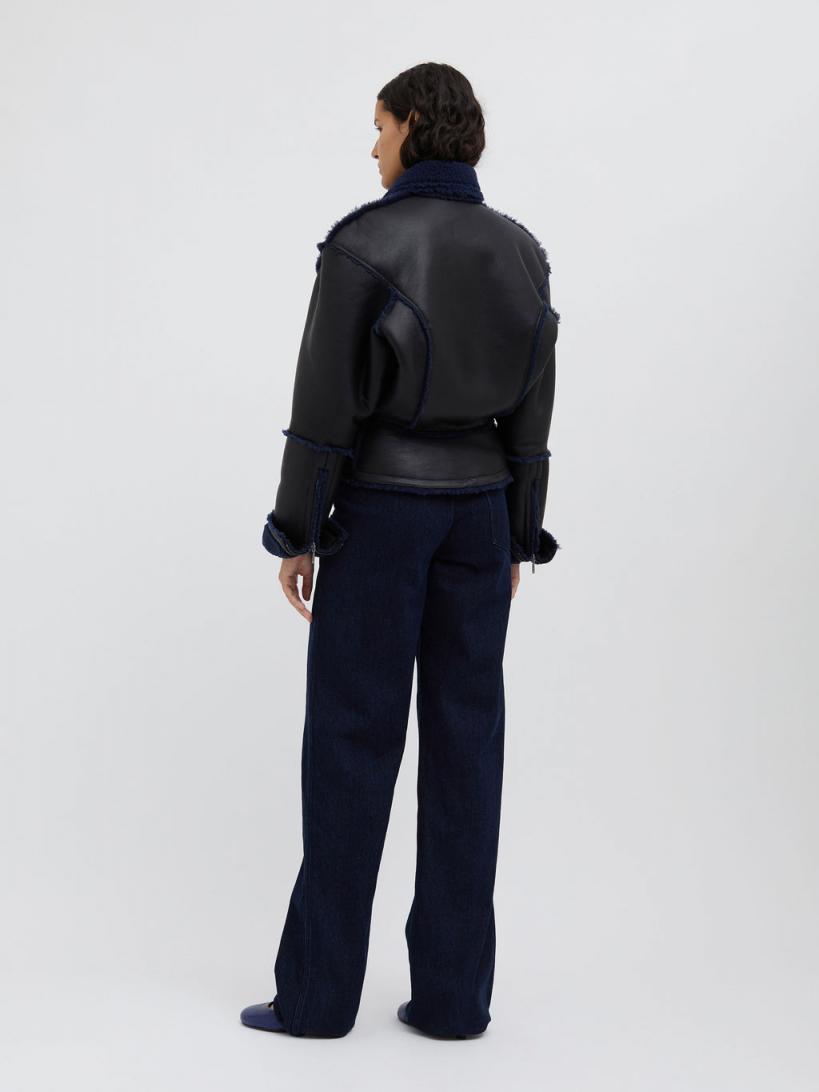 A soft grained leather jacket of buttery tactility, combining a modern shape with softened volumes of a classic aviator bomber. Defined by contrast blue graphite shearling & accent trim throughout. Soft matte finished nappa leather Concealed zip closure Side slip pockets Relaxed fit Full shearling lining 100% Lambskin Scarlett is 175cm/5’8.5” & wears size AU 8 (US 4)AU sizing