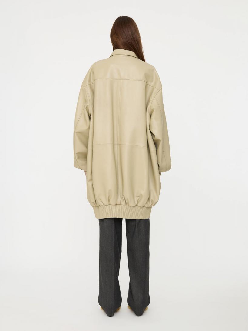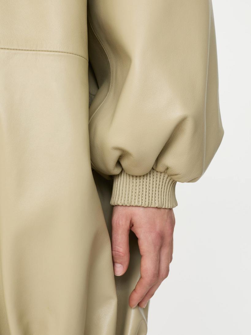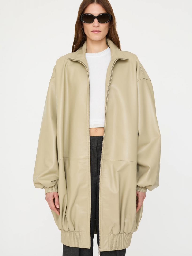 The classic bomber is dissected and expanded. Sleeves are emphasised and softened, whilst a hem is extended by seamwork. Finished with an oversized zip collar and rib trim. Ultrasoft lambskin leather Oversized mid length silhouette Seamed panel finishing on sleeves and back Rib stitch trim Zip front closure Oversized collar 100% Lambskin Trim: 100% Viscose Lining: 100% Cupro