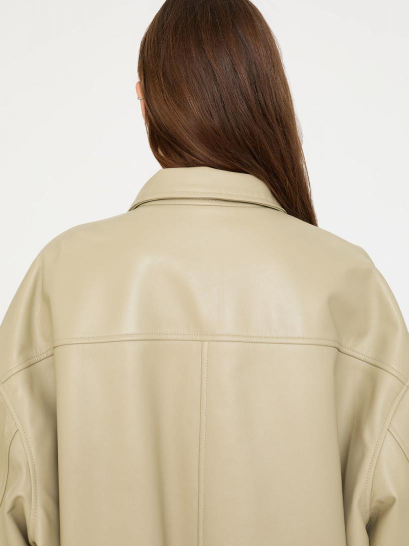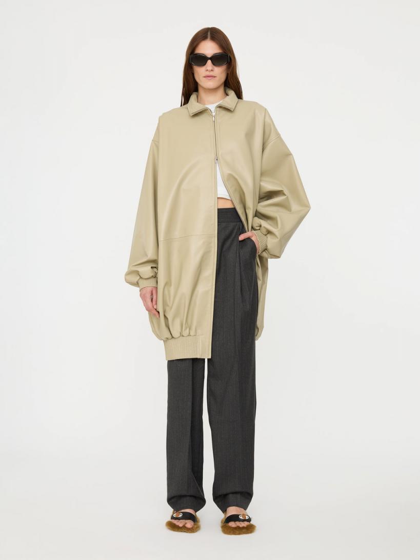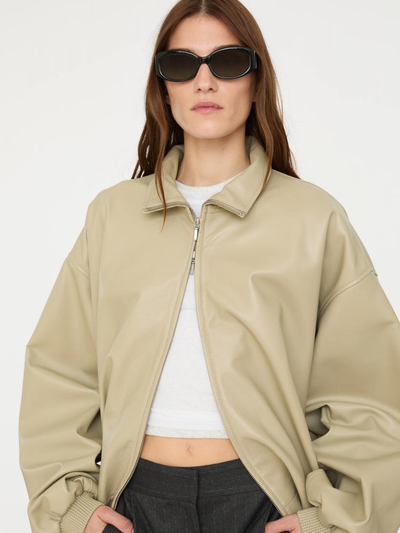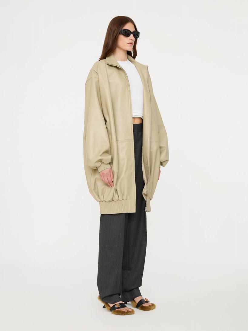 The classic bomber is dissected and expanded. Sleeves are emphasised and softened, whilst a hem is extended by seamwork. Finished with an oversized zip collar and rib trim. Ultrasoft lambskin leather Oversized mid length silhouette Seamed panel finishing on sleeves and back Rib stitch trim Zip front closure Oversized collar 100% Lambskin Trim: 100% Viscose Lining: 100% Cupro