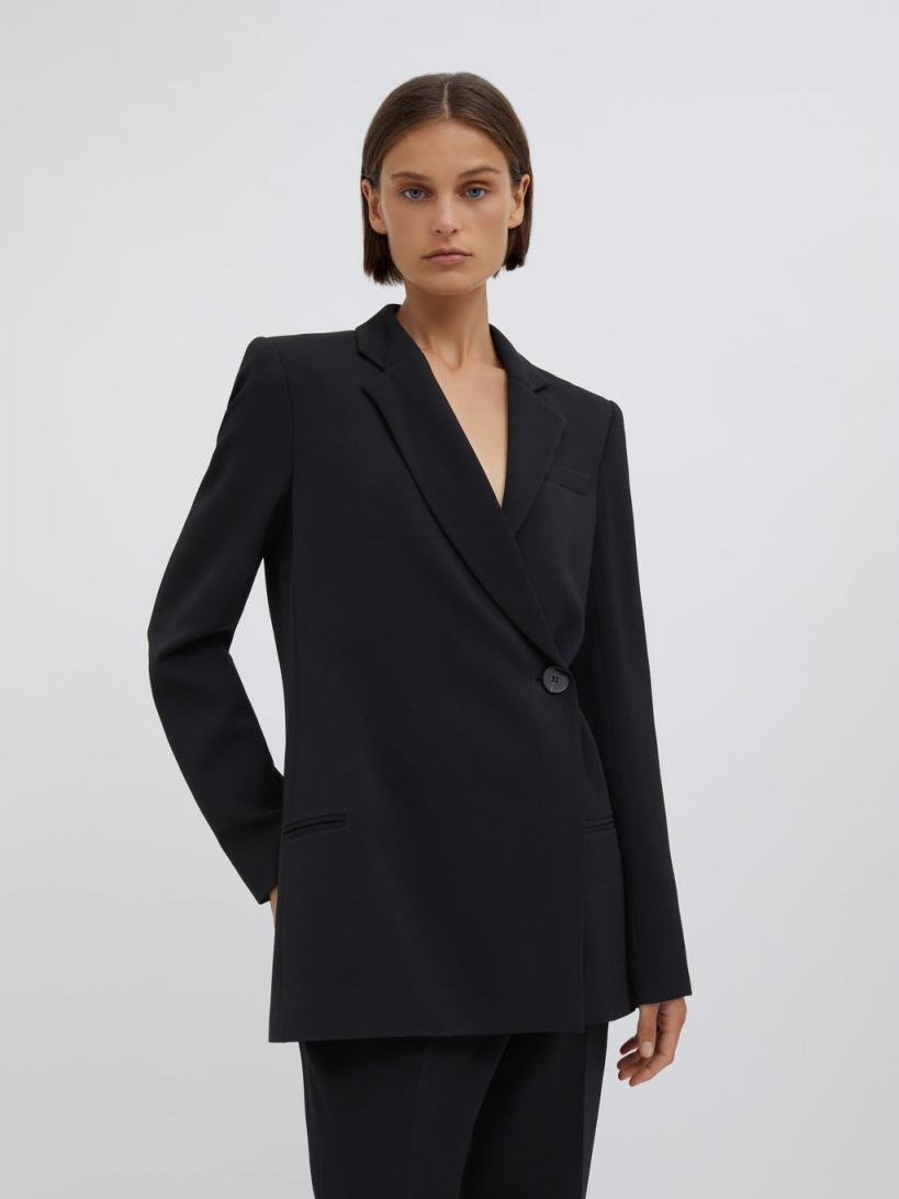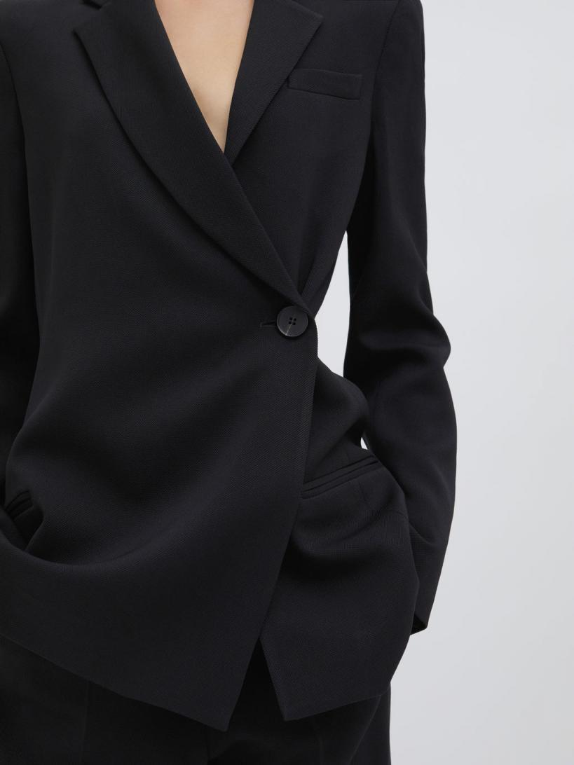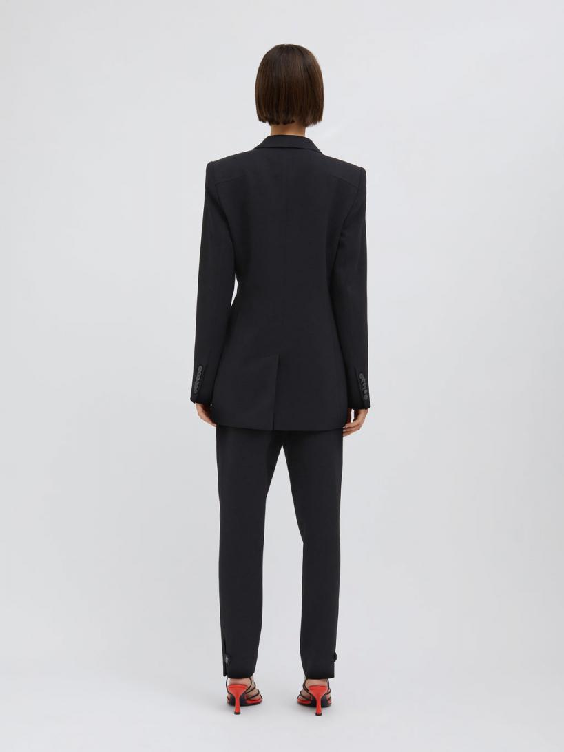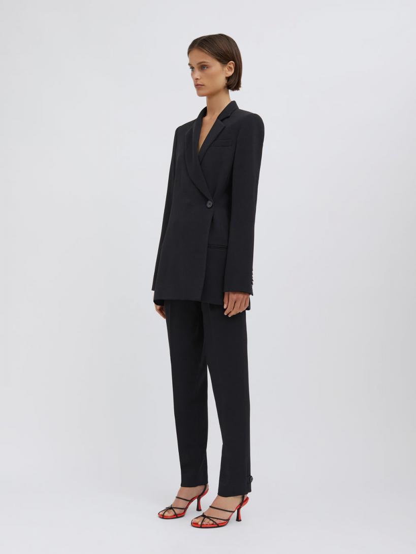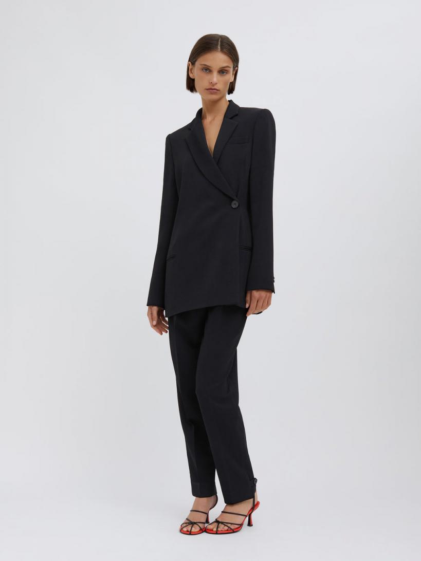 Balancing structure, utility and femininity. A relaxed fit blazer cinches at the waist with an off-centre single button closure. Cut in a structured Italian sourced twill suiting. Italian sourced textured suiting Accentuated padded shoulders Double breasted inspired wrap front Back waist shaping panels Single button closure Double jetted pockets 100% Polyester Lucianne is 177cm/5’9” and wears size AU 6 (US 2)AU sizing