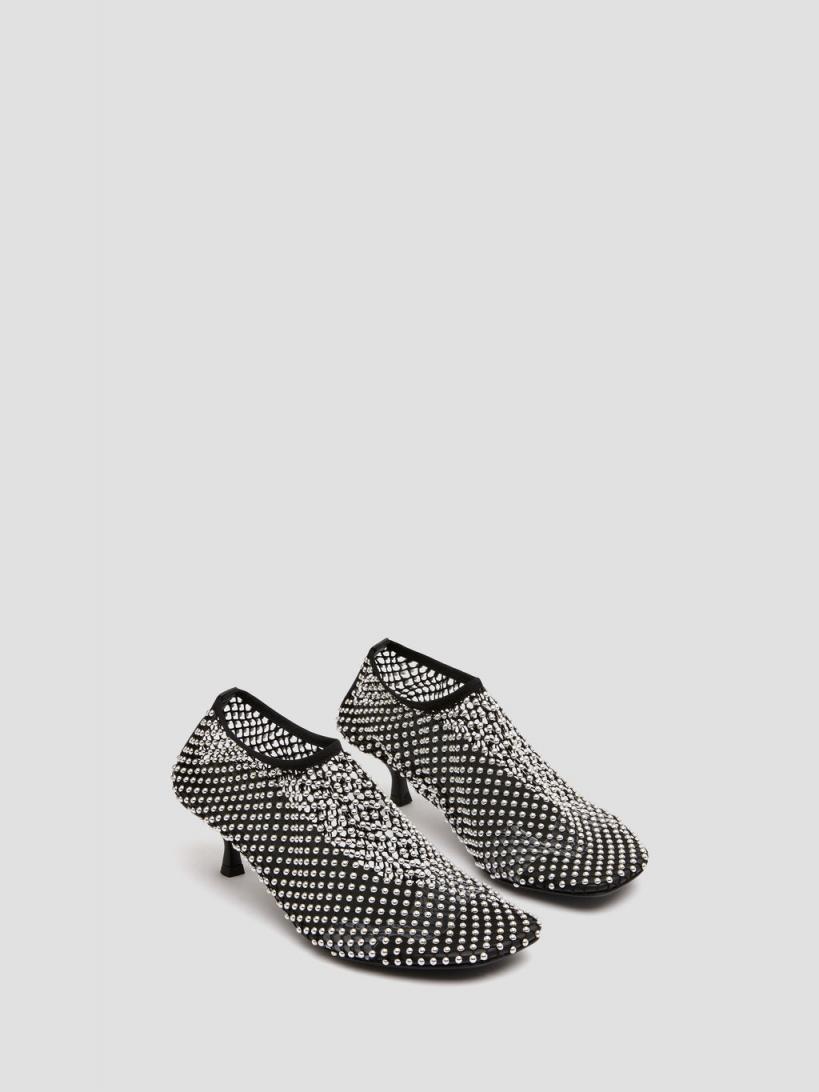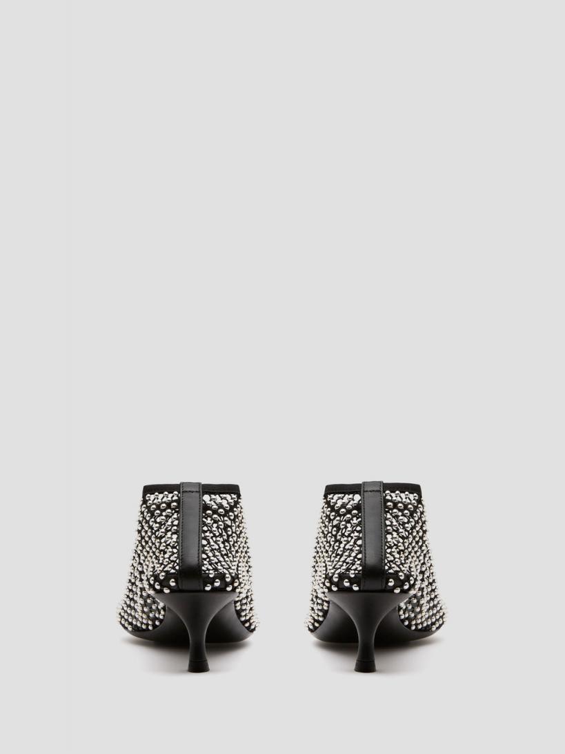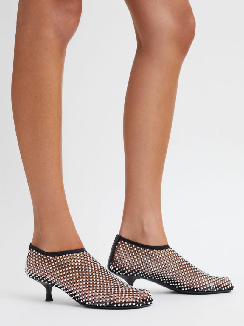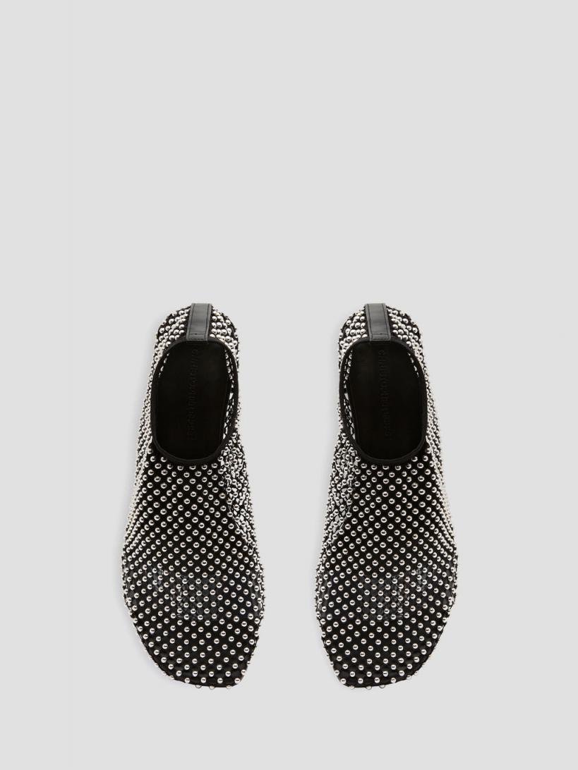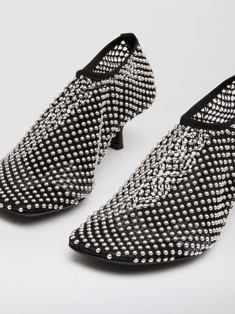 A studded mesh, slip-on ballerina shoe elevated on a micro heel. Italian craftsmanship is revealed in the precisely hand applied metallic silver studs. Crafted in Italy Mesh netting with stud embellishment Micro Heel Leather sole Sock-like slip on silhouette Elasticated ankle opening for ease of wear Heel Height: 50mm Upper: 93% Polyester 7% Spandex with metal studs Sole: 100% Calf Leather Footwear is in IT sizing