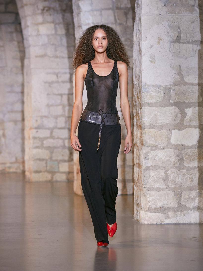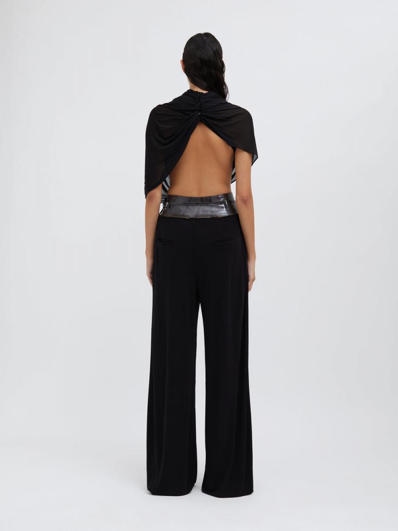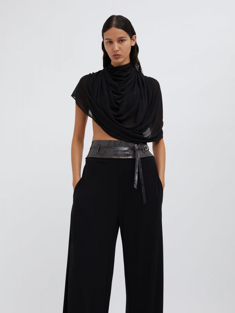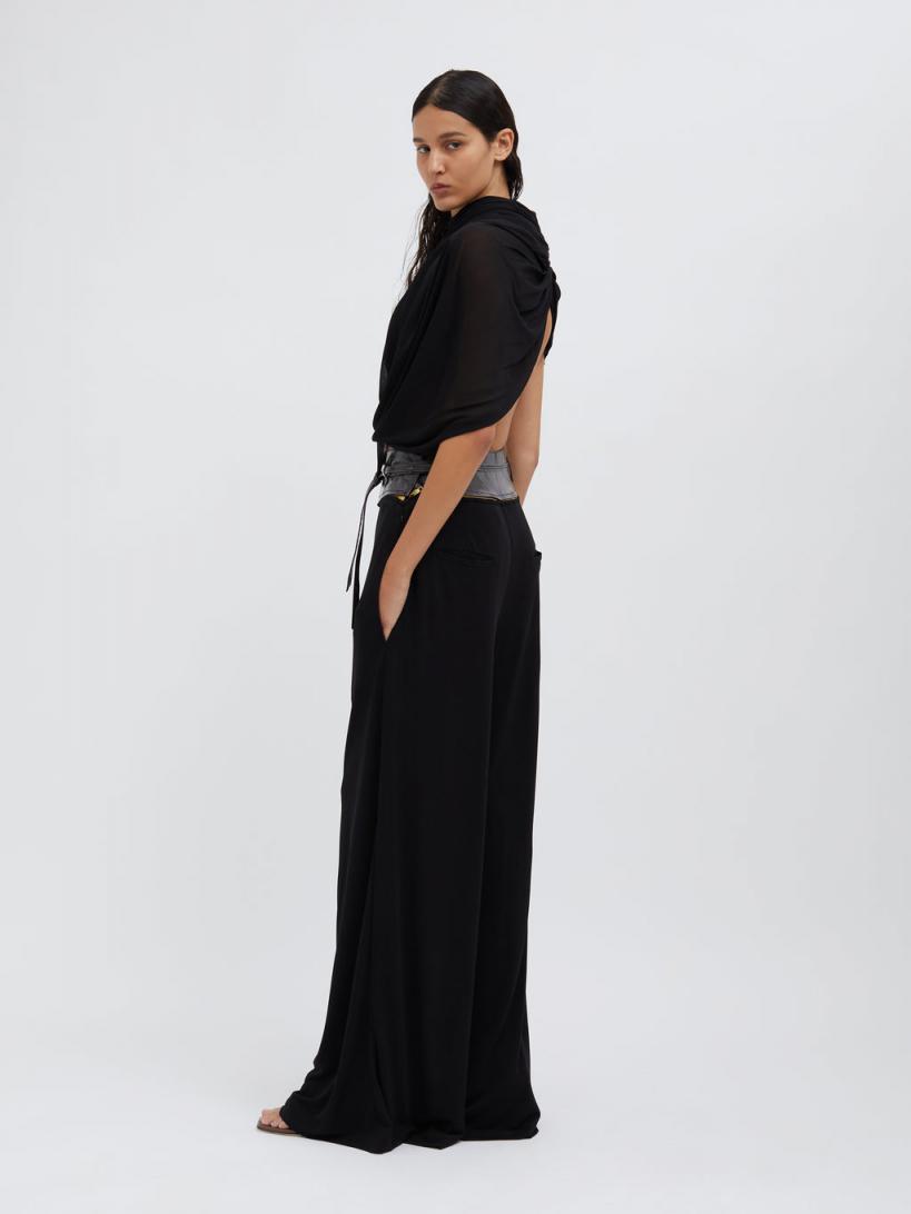 Spring Summer 2024 Look 28 Elephant ear plant 80% recycled polyester 20% recycled polyamide, 100% Viscose Vegan leather waistband attached to jersey pants Tailored fit waistband Relaxed fit Full length silhouette Dry clean only Scarlett wears a size 8 AusHeight 175cm/5”8.5”