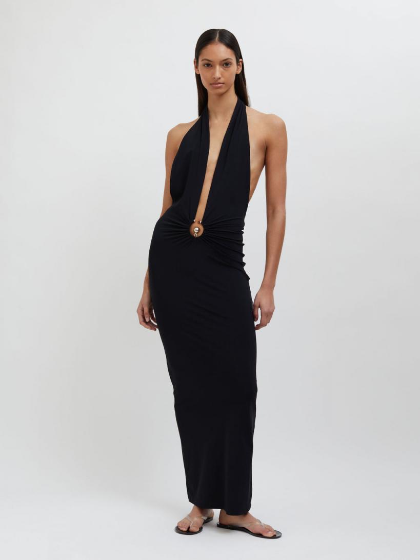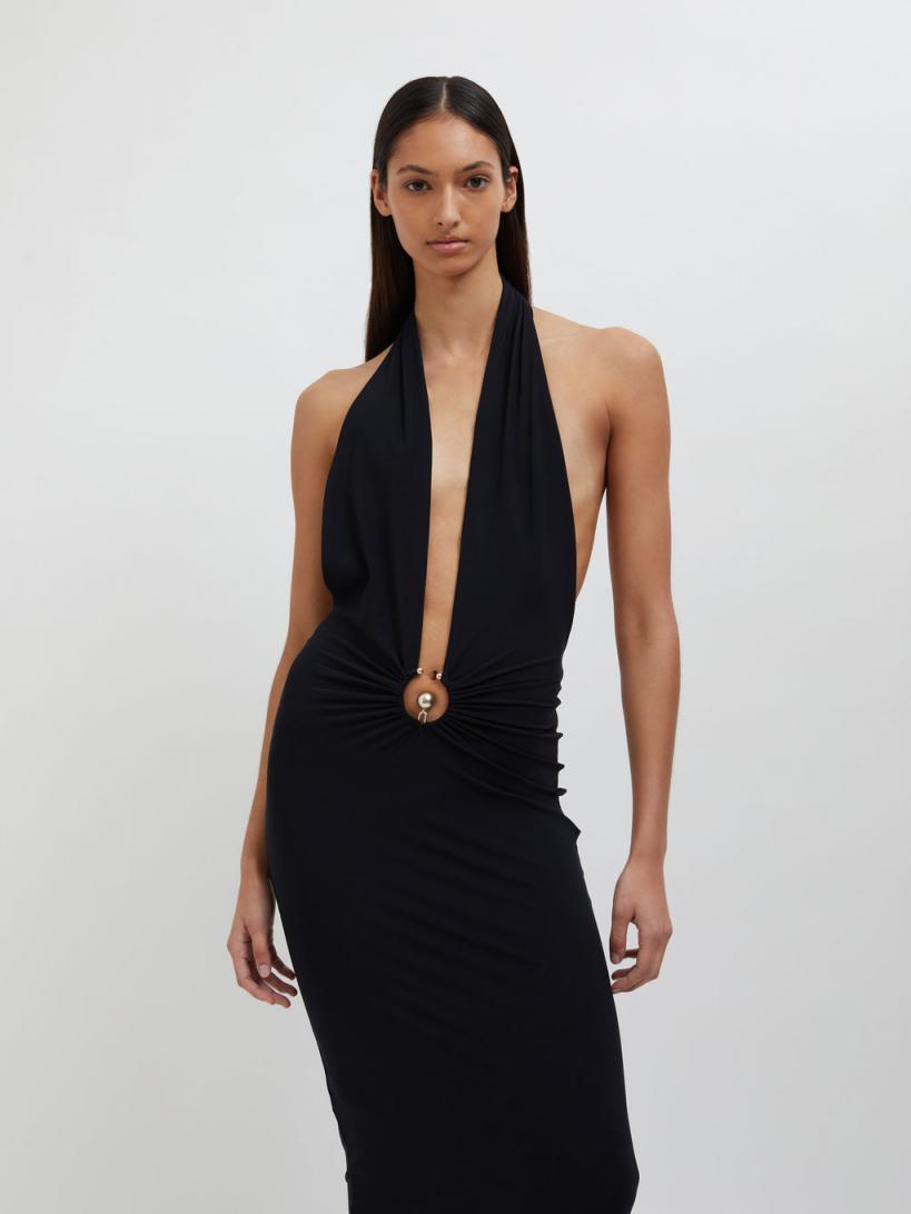 72% Polyamide 28% Elastane, 100% Zinc Alloy Stretch blend Matte finish Signature brass orbit detailing Halter silhouette True to size Hand wash in luke warm water Lauren is 178cm/5’10.5” & wears size AU 8 (US 4)AU sizing
