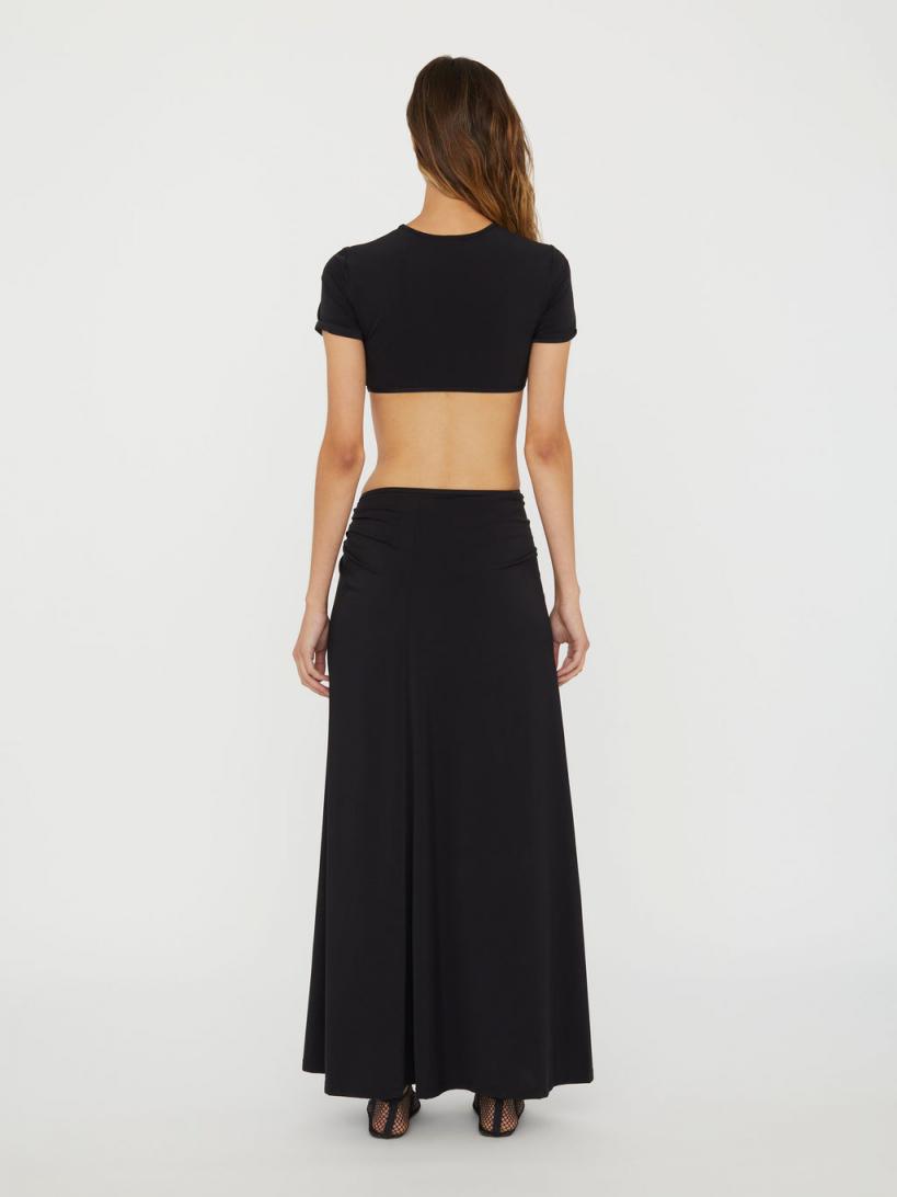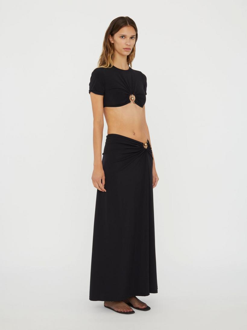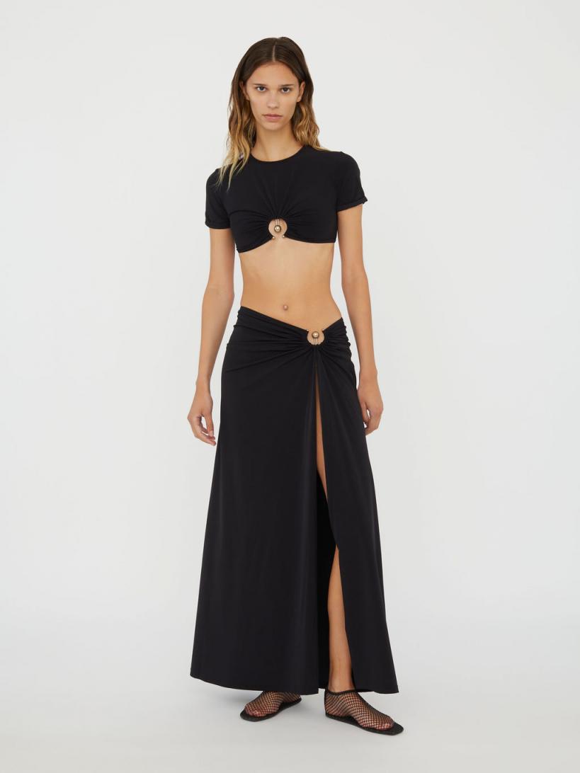Hooked with a sculpted metal adornment, this maxi a-line skirt features an open split front, ruched and anchored by signature orb hardware. Signature brass orb hardware Maxi a-line skirt True to size Matte finish Stretch lycra fabrication Main: 72% Polyamide 28% Elastane, Hardware: 100% Brass Amélie is 180cm/5’11” and wears size AU 8 (US 4)AU sizing