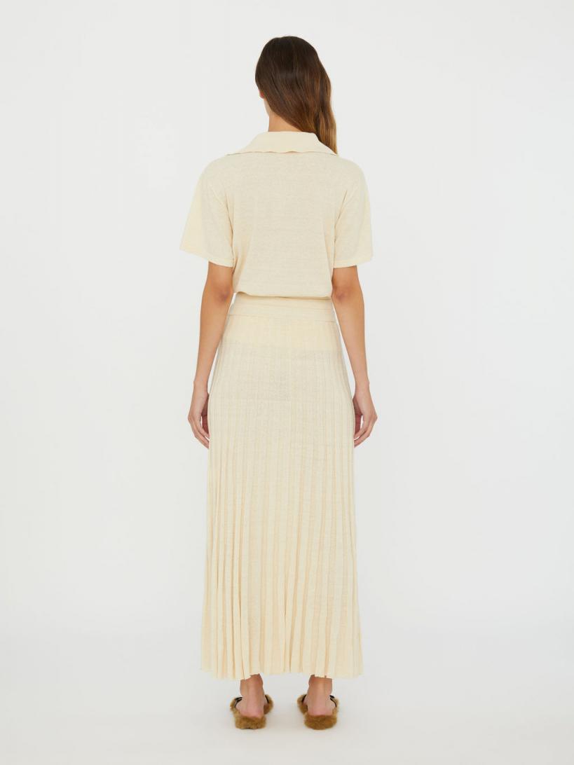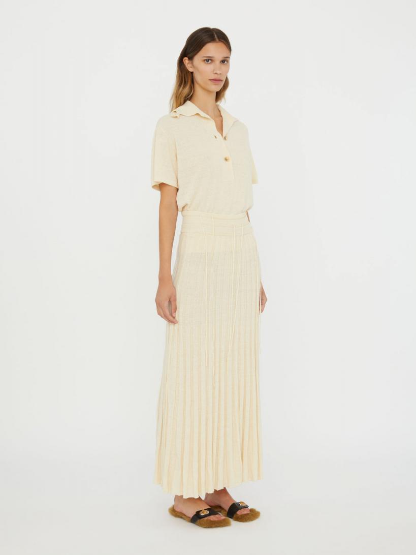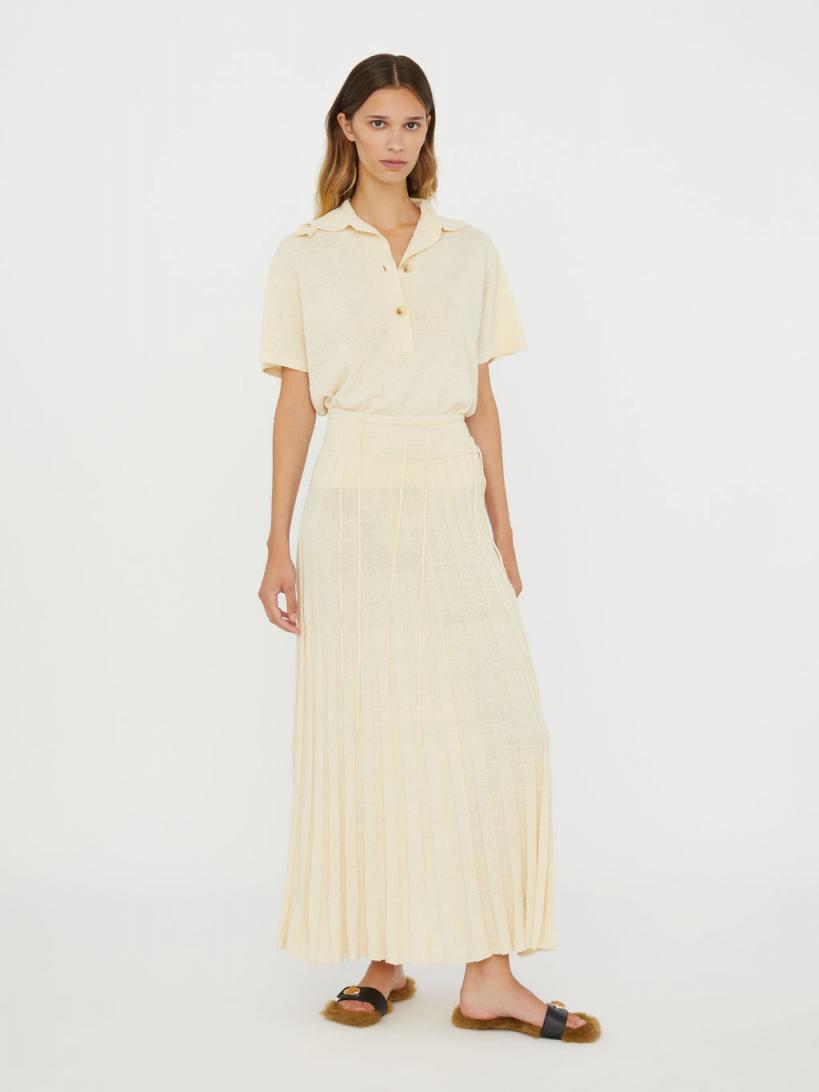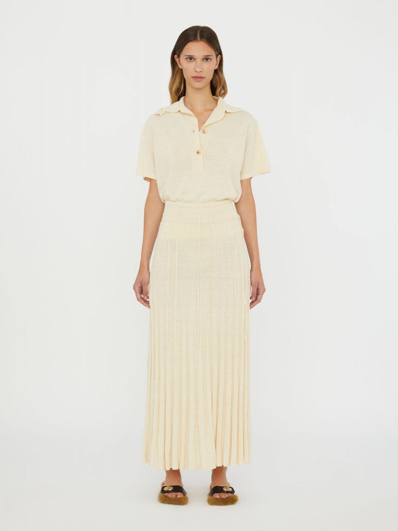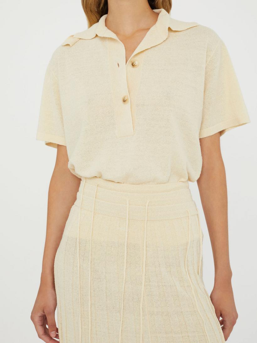Designed for elevated beachside dressing. Featuring a polo inspired collar, this knitted short sleeve top is crafted in a lightweight silk and linen blend, finished with a finely ribbed trim that shapes the waist. Polo button down neckline Collar placket detailing Fine ribbed waistband panel Short sleeves Lightweight fabrication 48% Linen 48% Silk 4% Polyamide Amélie is 180cm/5’11” and wears size AU 8 (US 4)AU sizing