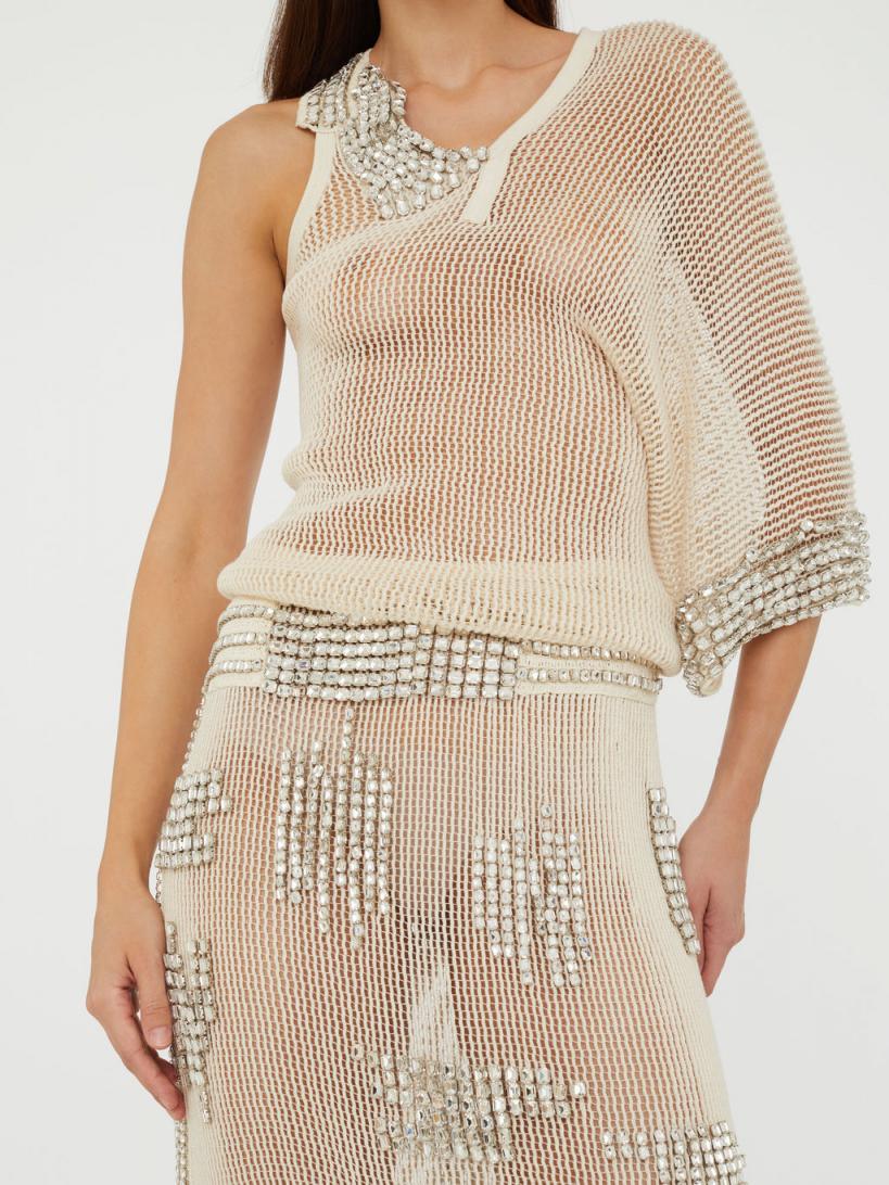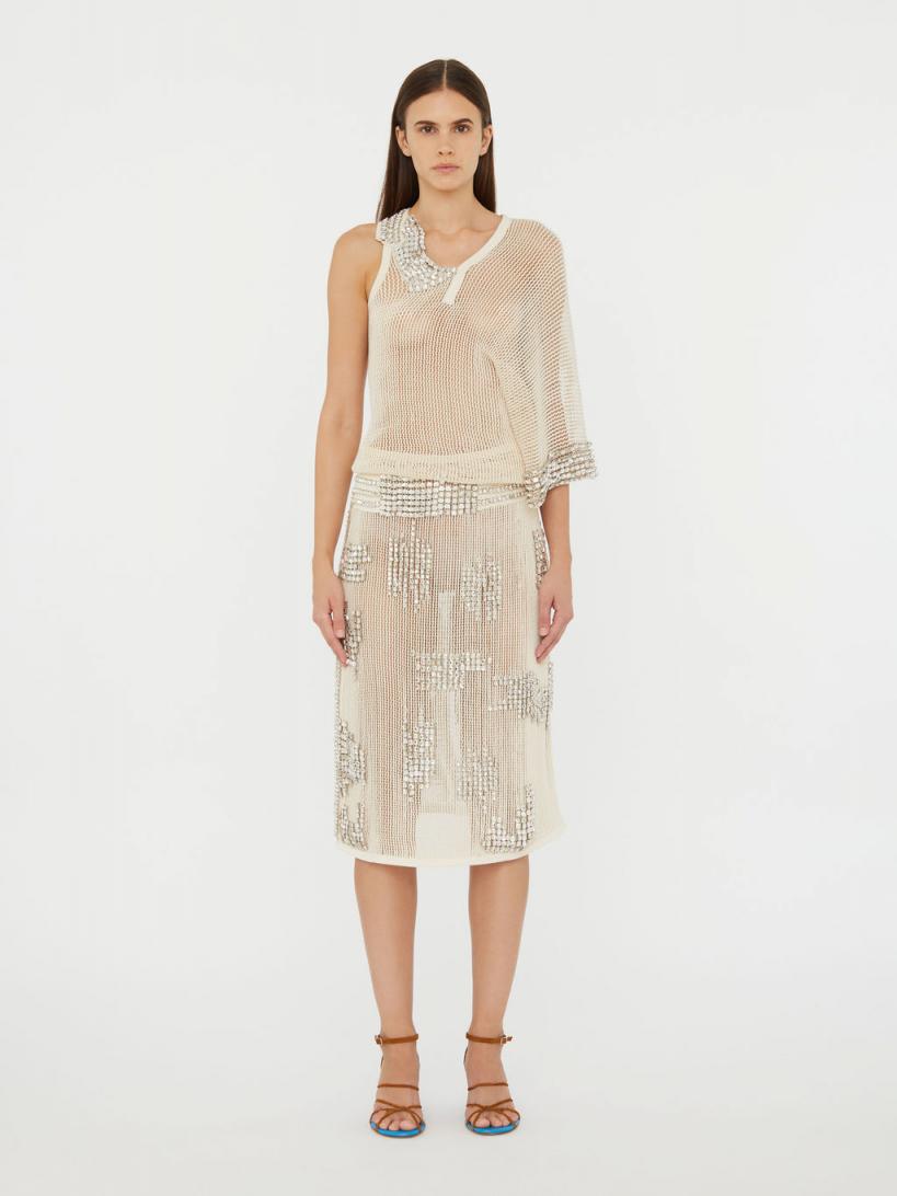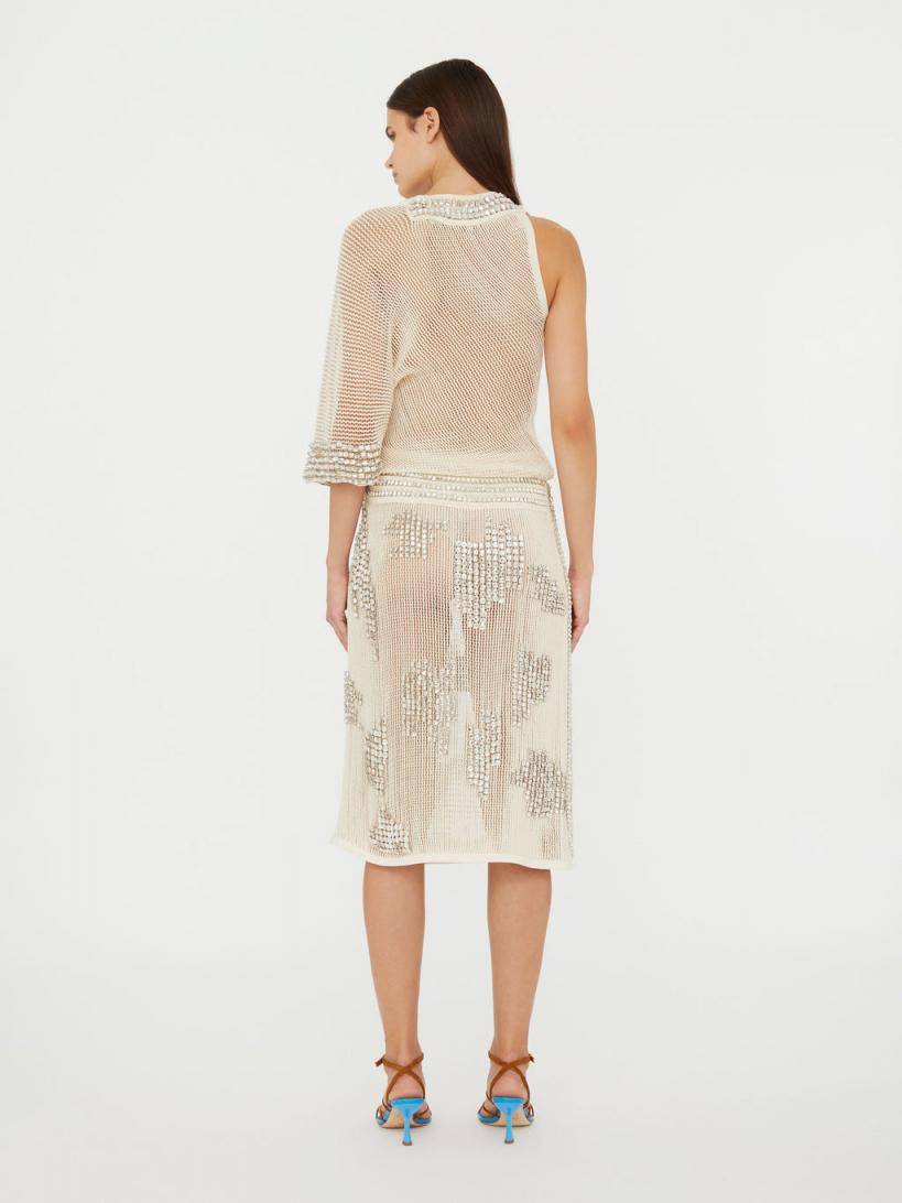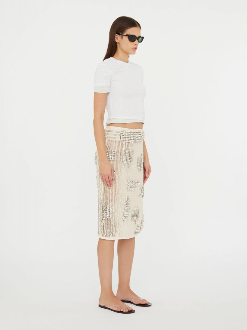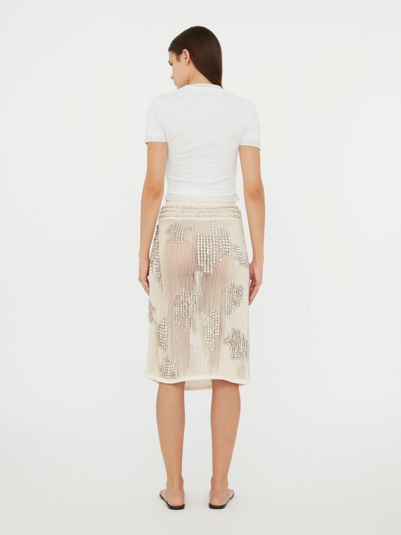 Creating moments of unconventional beauty through contradicting ideas. Glass crystals are collaged to an otherwise utilitarian swiss cotton mesh. This straight midi skirt cuts low at the waist. Hand applied glass crystals Low waisted Slip on silhouette Midi length Straight skirt 100% Cotton Trim: 100% Glass Crystals Wioletta is 178cm/5’10” and wears size AU 8 (US 4)AU sizing