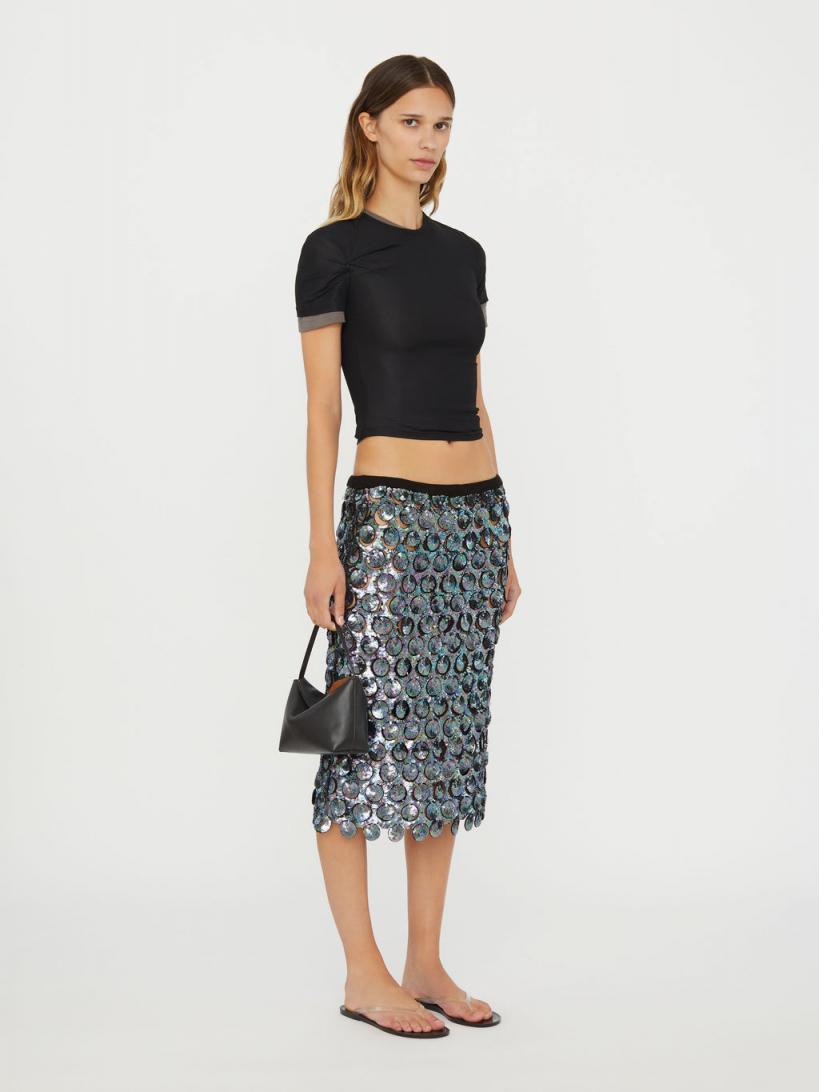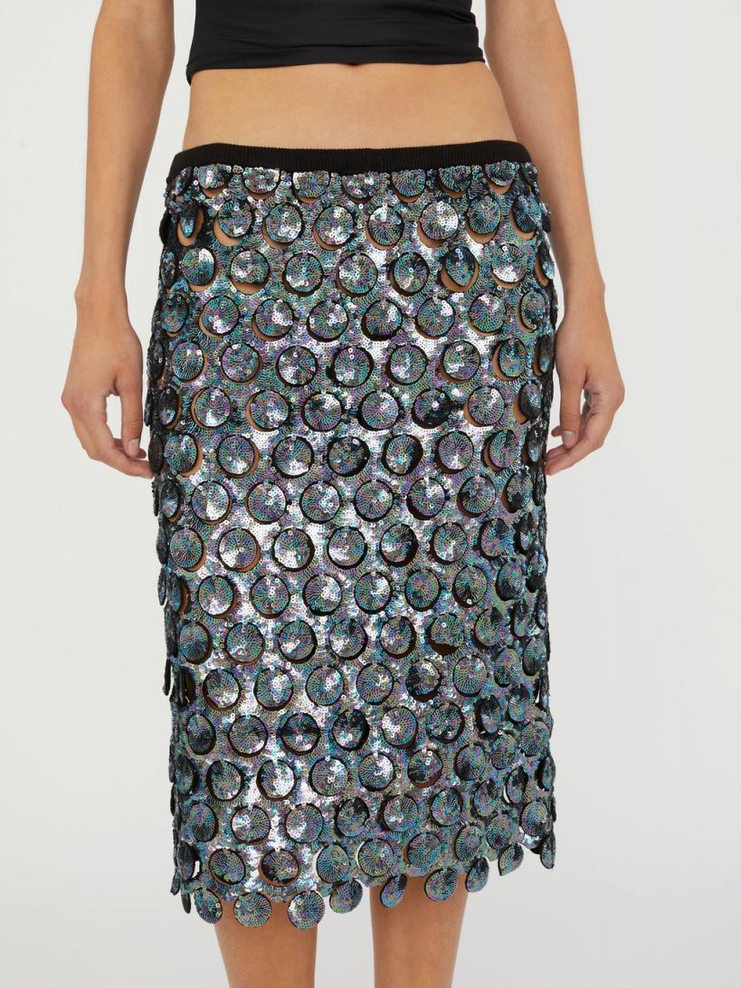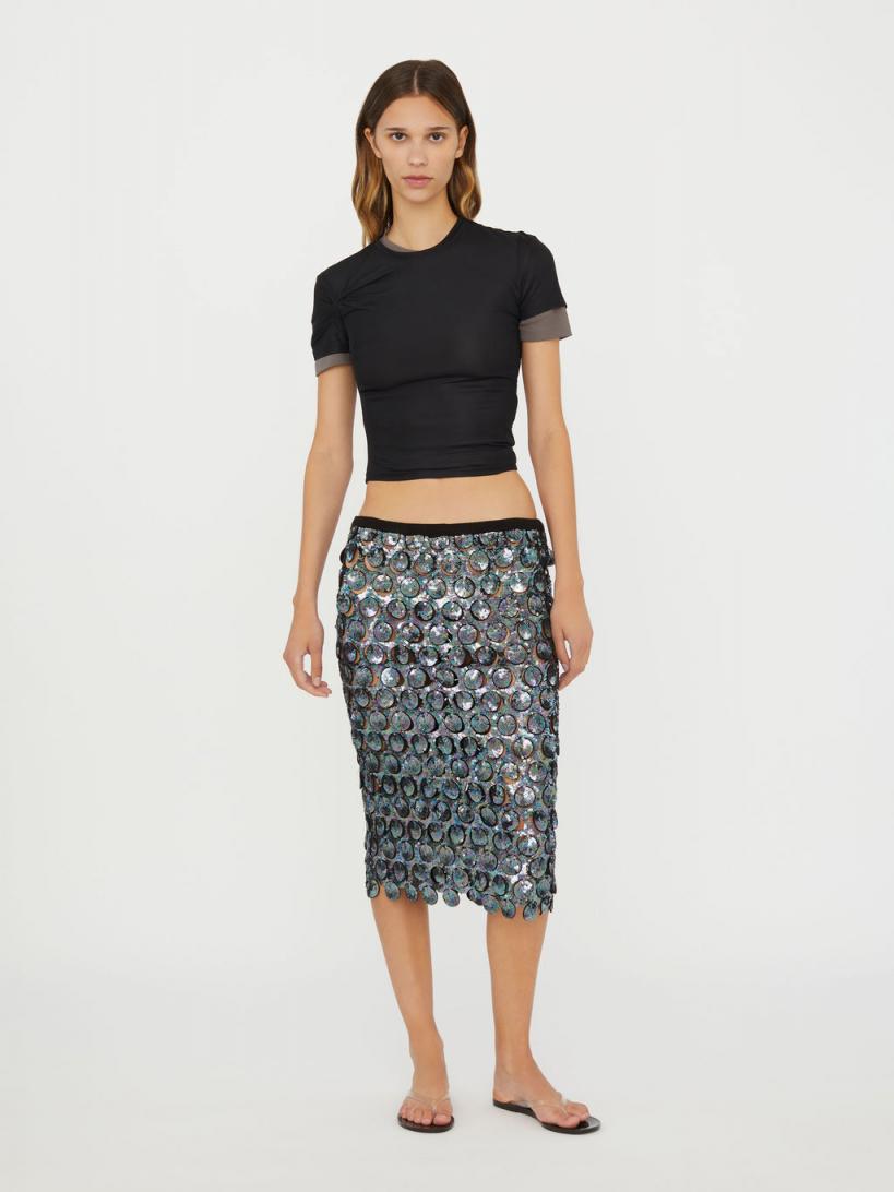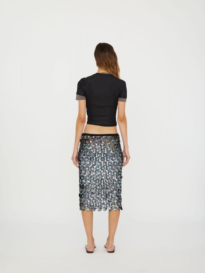 Creating moments of unconventional beauty through contradicting ideas. This artisanal sequinned skirt combines scale-like hand crocheted cotton adorned with multi tonal sequin embellishment. Midi length skirt Fine cotton rib waistband Can be worn mid-low waisted Straight silhouette Hand crocheted Multi tonal sequin embellishment 100% Cotton Trim: 100% PET Sequin Amélie is 180cm/5’11” and wears size AU 8 (US 4)AU sizing