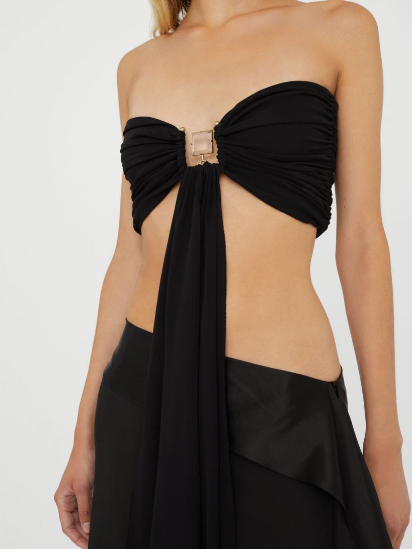 A strapless draped top adorned with signature bezel hardware. Featuring hand crafted natural clear quartz, with properties that balance emotion, dispel negativity and enhance mental clarity. Handcrafted natural crystal quartz hardware Strapless bandeau top Cascading front draping Luxe dry jersey fabrication Main: 100% Viscose, Hardware: 100% Natural Stone with Copper frame Amélie is 180cm/5’11” and wears size AU 8 (US 4)AU sizing