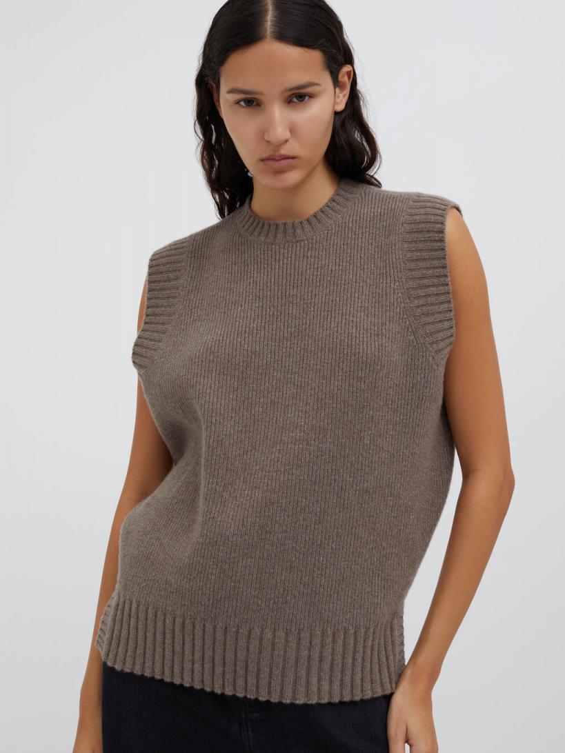 Transformative knitwear is revealed in this reconstructed cut away cashmere knit vest. Designed with a round cut away back panel, offered in a warm taupe hue. Rounded open cut-away back Sleeveless relaxed knit vest Rib stitch trim traces edges Medium weight knit 100% Cashmere Scarlett is 175cm/5’8.5” & wears size AU 8 (US 4) AU sizing