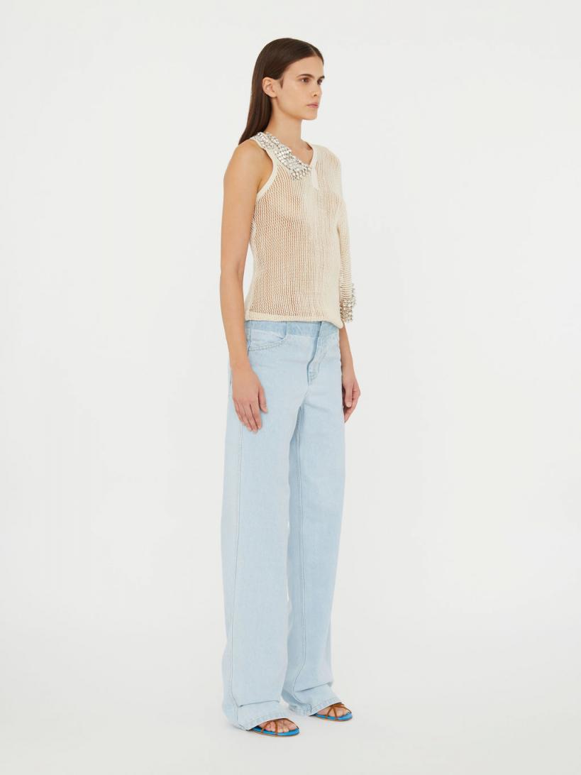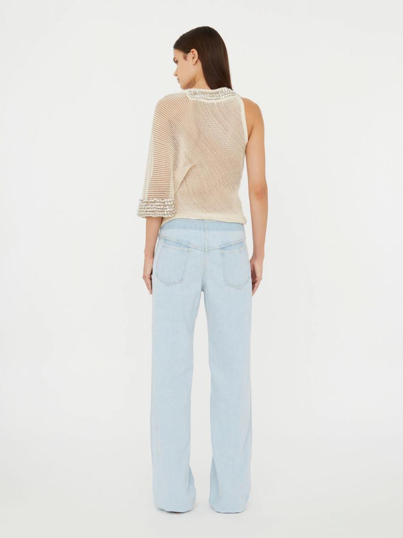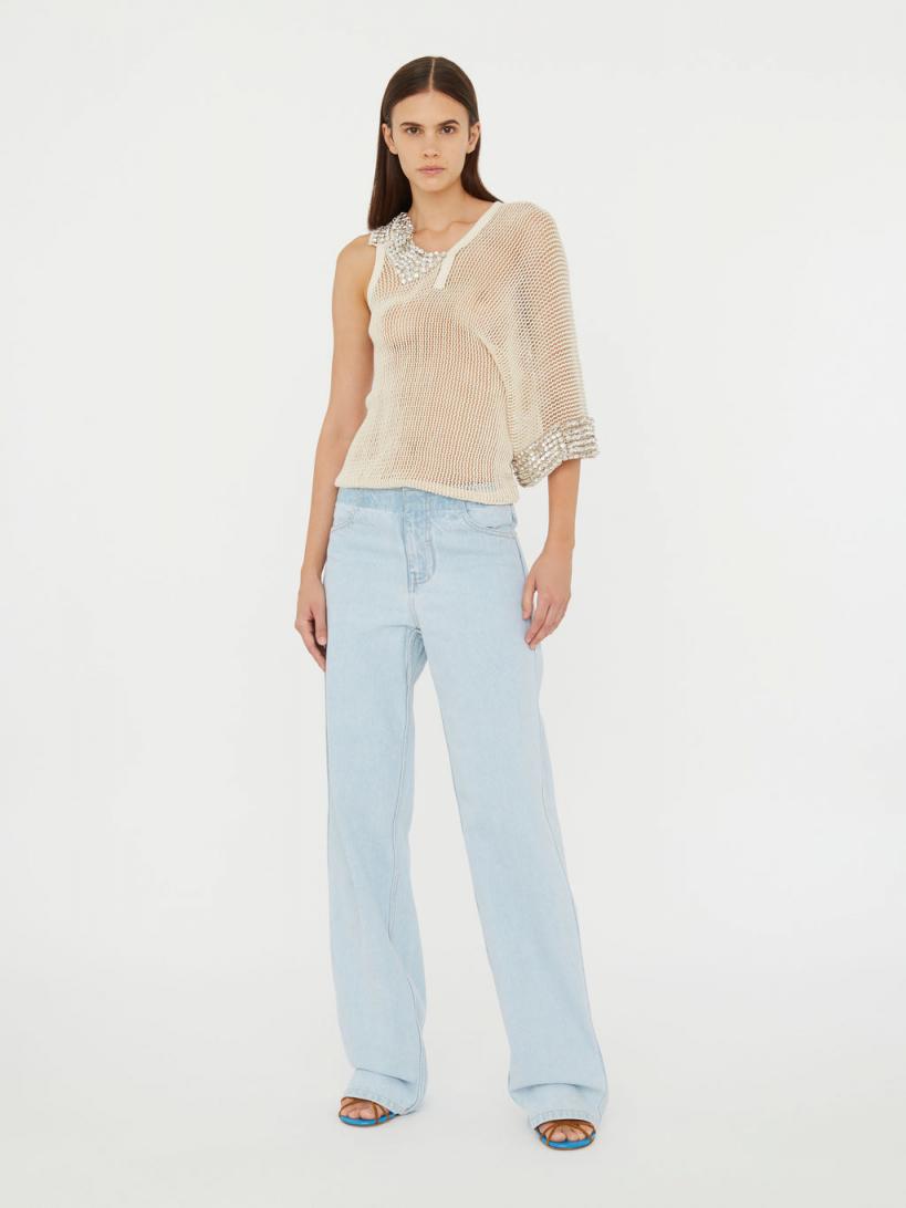 Creating moments of unconventional beauty through contradicting ideas. Glass crystals are collaged to an otherwise utilitarian swiss cotton mesh. This slouchy one shoulder top features a dropped oversized sleeve. Hand applied glass crystals Asymmetrical one shoulder V neckline Rib trim Oversized slouchy sleeve 100% Cotton Trim: 100% Glass Crystals Wioletta is 178cm/5’10” and wears size AU 8 (US 4)AU sizing