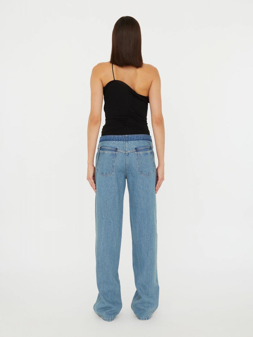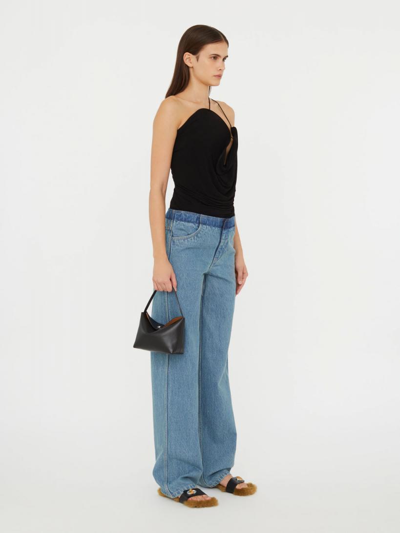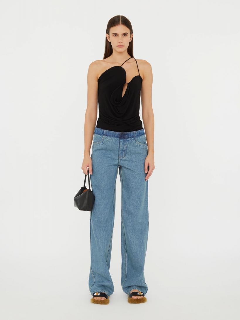Fine Italian jersey is anchored by sculpted wave hardware. This low scooped neck top is suspended by fine straps that meet at one shoulder. Wave formation sculpted wire inserts Soft stretch mesh fabrication Soft side seam ruching Fine straps sit on one shoulder 92% Viscose 8% Elastane
